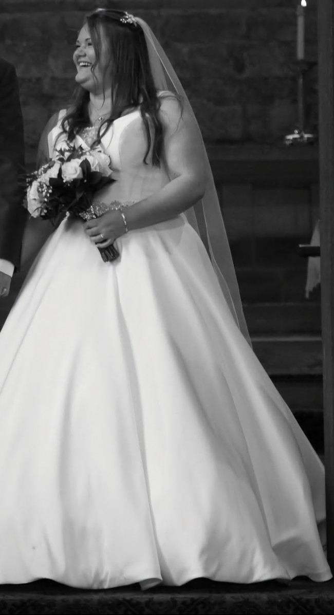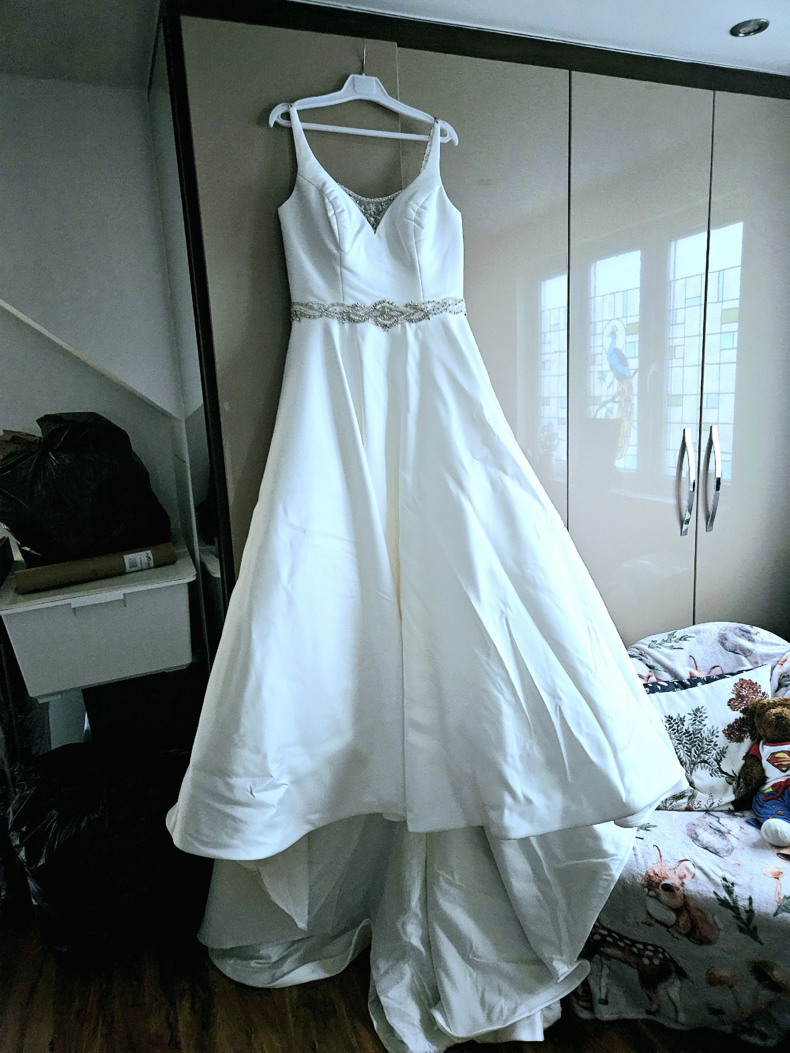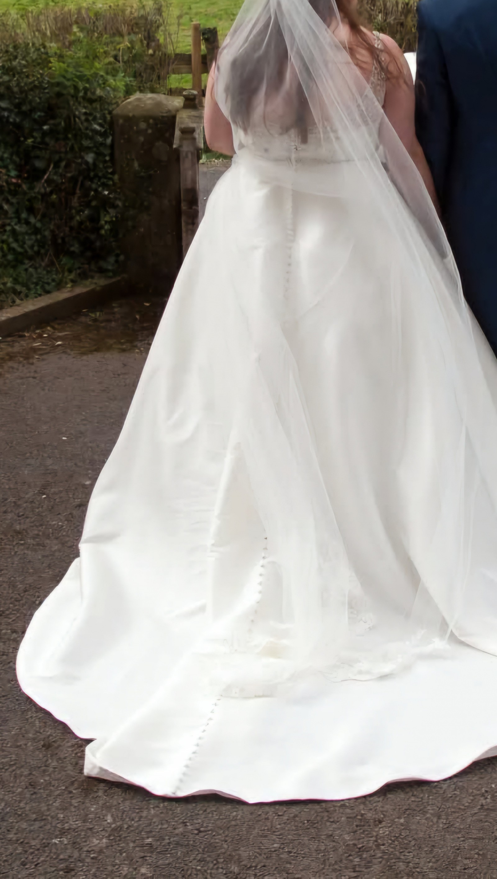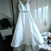 - Taken up in length for a Bride who is 5'4, sheer and beads added to front v neck area for less cleavage, white panel added at back under sheer area so it's not fully see-through at the back