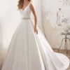 Maribella Satin A-line Bridal Gown Featuring a Crystal Beaded Sheer Back and Waistline. Covered Buttons Trim the Back and Train.