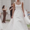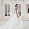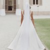 This sophisticated satin wedding gown embodies modern elegance with a timeless silhouette. Crafted from luxurious structured satin, the dress features a beautifully draped bodice that softly contours the figure while offering effortless refinement.