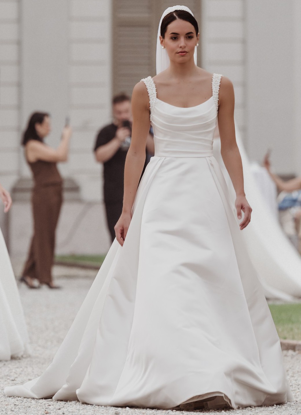 The gently scooped neckline is framed by delicate wide straps adorned with subtle beaded detailing, adding a touch of texture and understated sparkle. The fitted waist enhances the natural silhouette before flowing into a voluminous A-line skirt, creating graceful movement and a regal presence with every step.