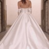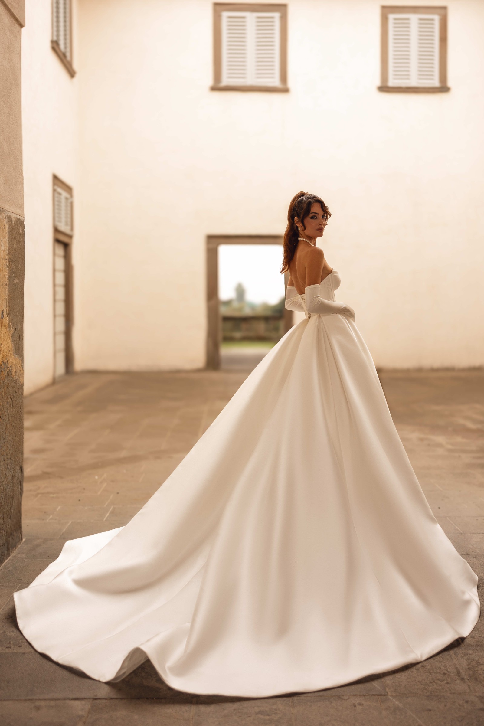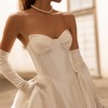 Crafted from luxurious satin, the skirt offers volume and movement with a regal presence, extending into a sweeping train that glides effortlessly with every step. The clean lines and minimalist aesthetic make this gown both powerful and undeniably elegant.