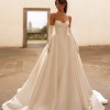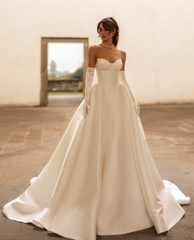 This breathtaking satin ball gown is the embodiment of timeless elegance with a couture-inspired edge. Designed for the bride who appreciates structure and sophistication, the gown features a sculpted strapless bodice with defined corset seaming that beautifully shapes and supports the silhouette.