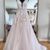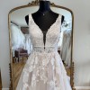 A romantic full A-line wedding gown featuring a sheer bodice with a slim V-neckline and fabric band, adorned with botanical-inspired floral lace that flows beautifully down the skirt. The elegant V-back is finished with cascading lace appliqués and fabric-covered buttons, creating a timeless bridal look perfect for your special day.