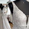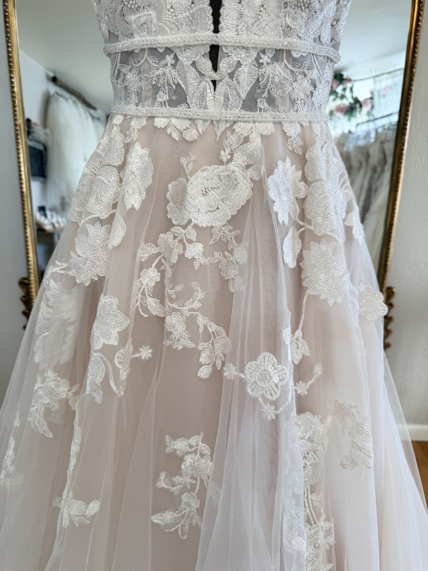 This gown has been tried on as a store sample, but is in stunning condition with no stains, tears, or imperfections.