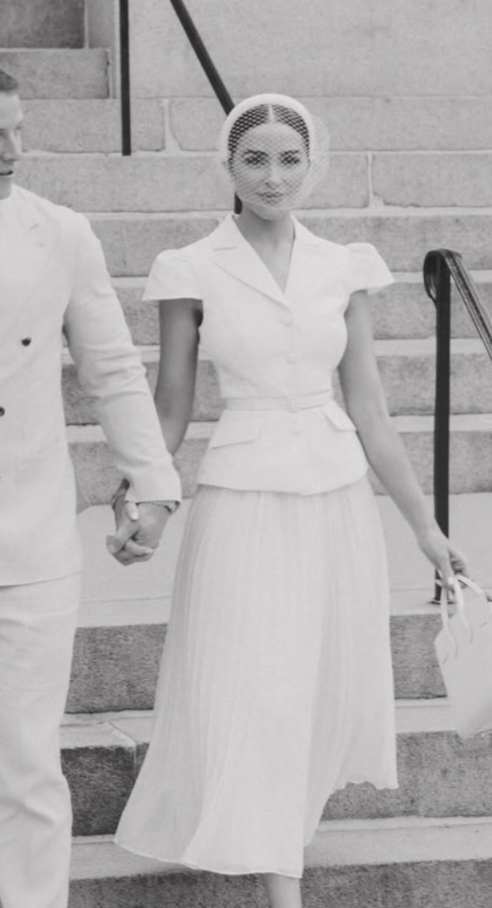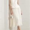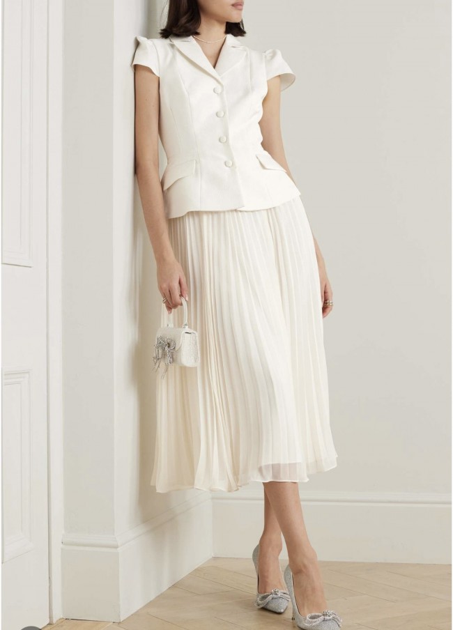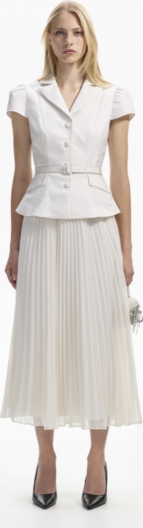 As described on Net-A-Porter: SELF-PORTRAIT Belted cloqué and pleated chiffon midi dress: Self-Portrait's white cloqué midi dress has an endlessly elegant shape reminiscent of Old Hollywood glamour. It has a tailored, fitted bodice with a waist-cinching belt and fans out to a pleated chiffon skirt. The influences may be retro but contemporary accessories will make it feel so current.
