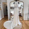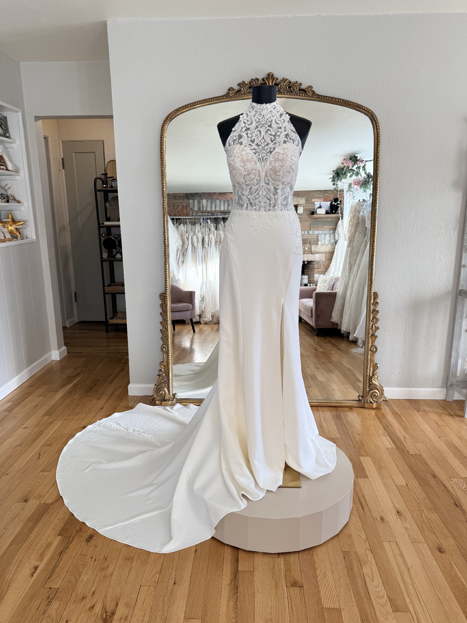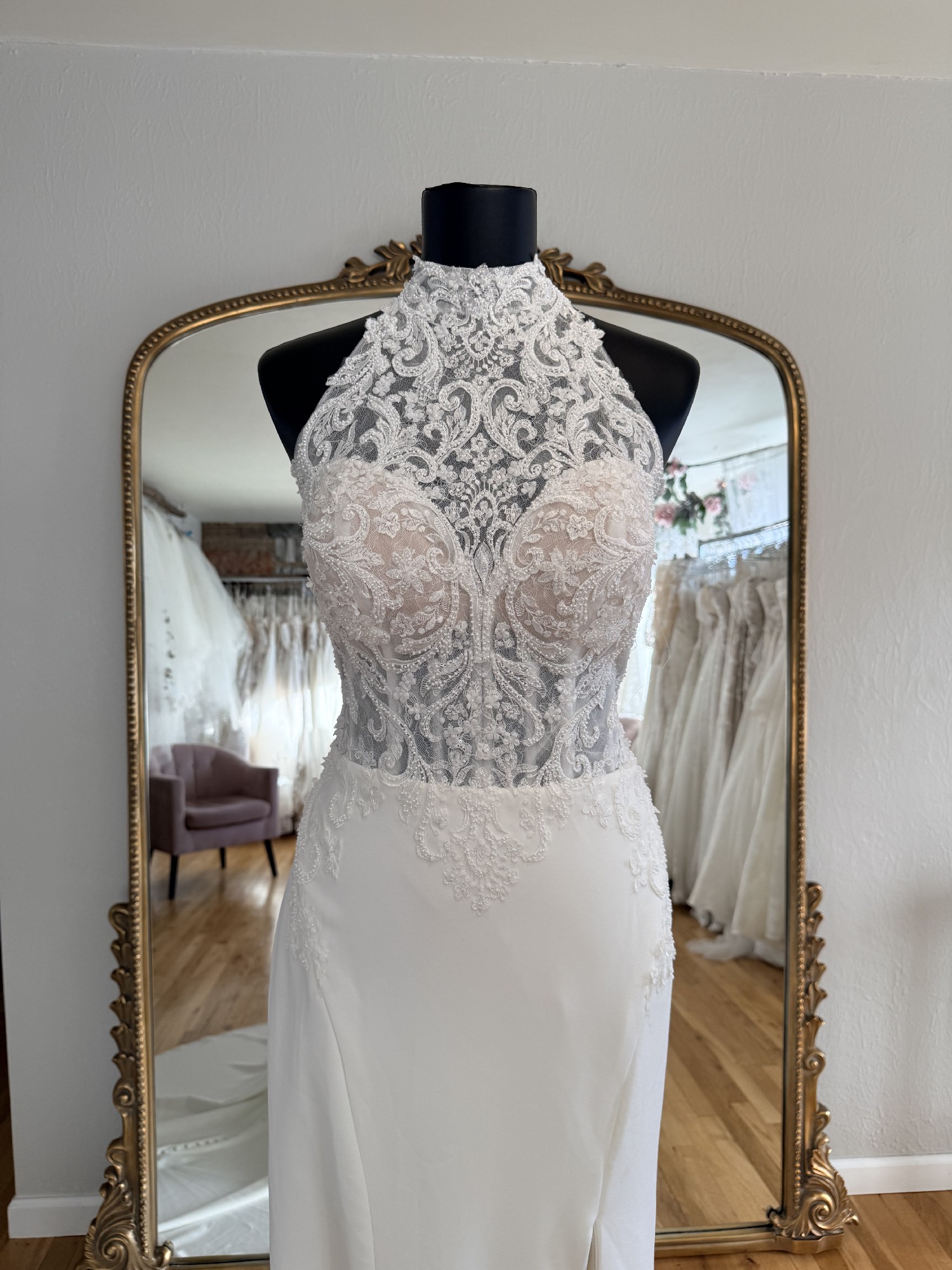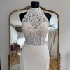 A glamorous fit-and-flare wedding gown with a high halter neckline and intricate graphic lace bodice accented with 3D floral details. It transitions into a sleek skirt with a high slit and a low open back for modern bridal elegance. This gown has been tried on as a store sample, but is in perfect condition with no marks, stains, or tears.