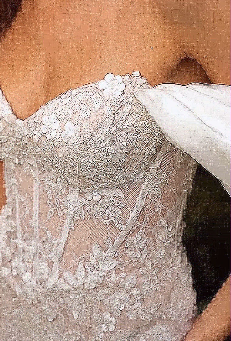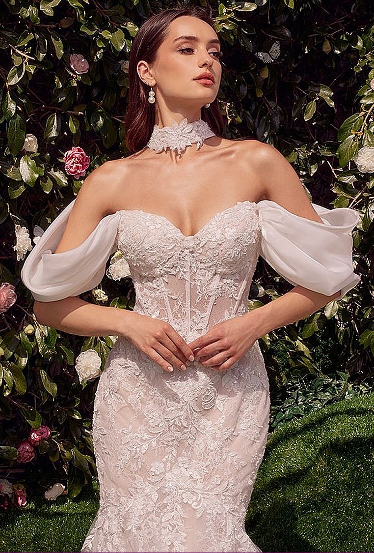 Design: Sweetheart neckline & removable organza off-the-shoulder shawl