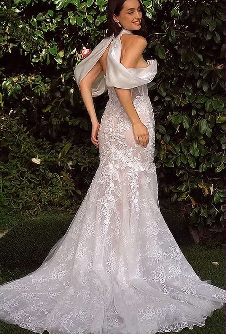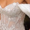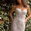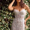 This strapless mermaid gown features a sweetheart neckline and a structured bodice for enhanced support, beautifully crafted from layered lace. This gorgeous gown! is also layered in delicate lace floral detail and satin with an intricate ribbed bodice besplangled with pearlescent beaded detail. The removable off-the-shoulder organza shawl adds a romantic touch, perfect for a sophisticated bridal look. Ideal as a wedding dress, this gown exudes timeless elegance and grace.