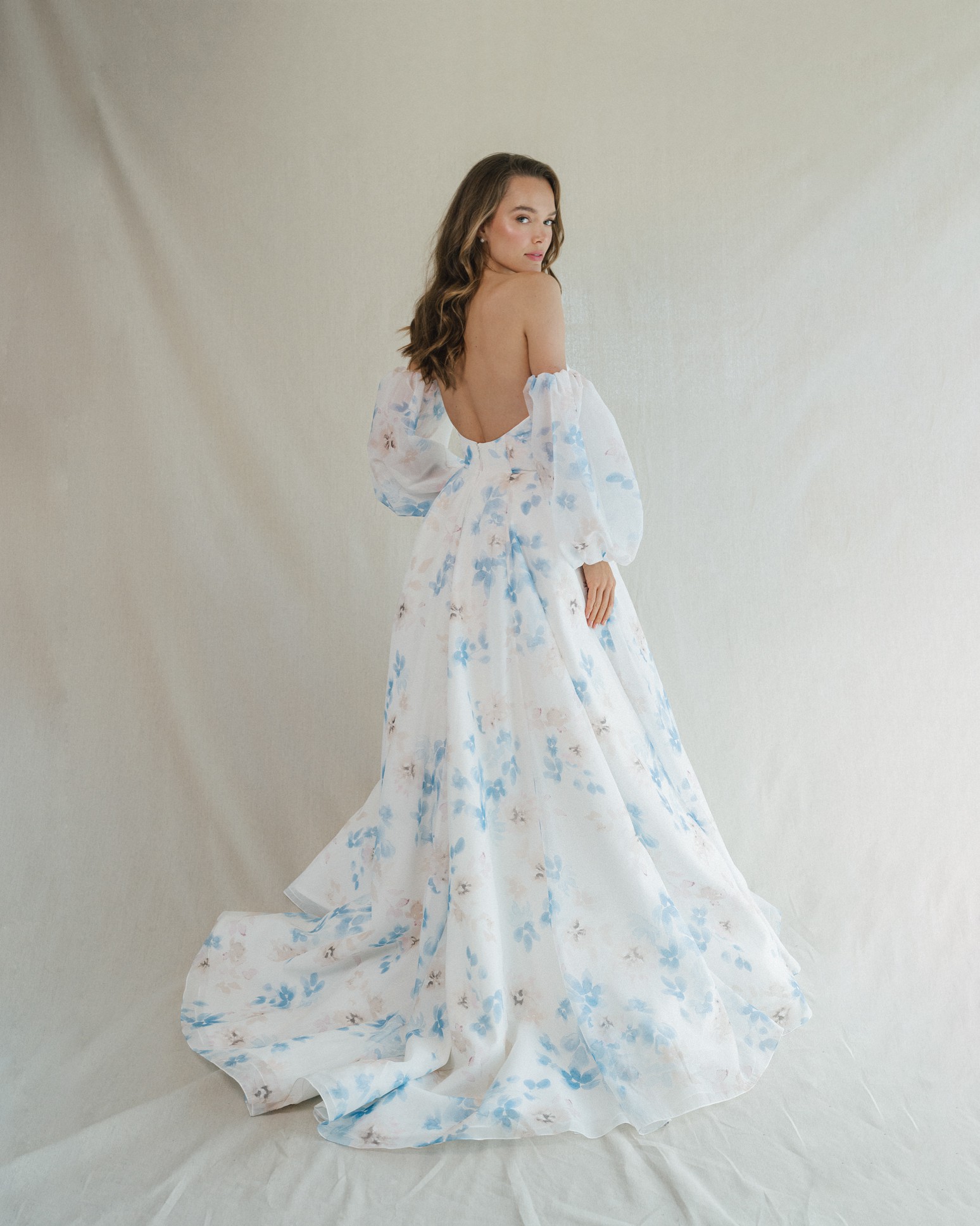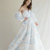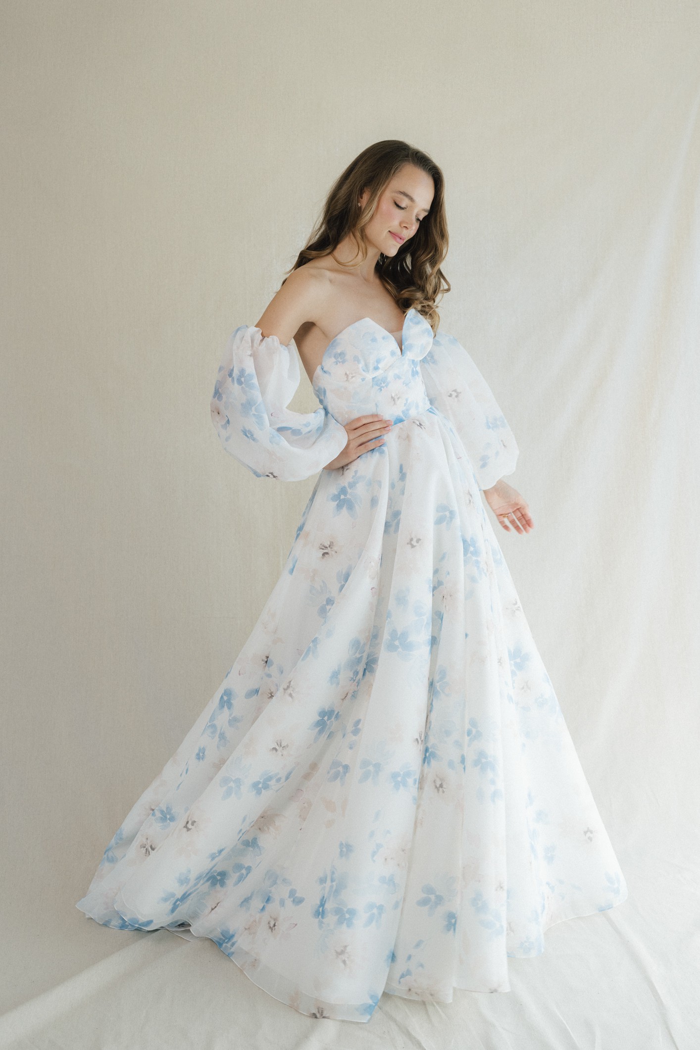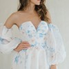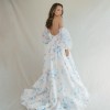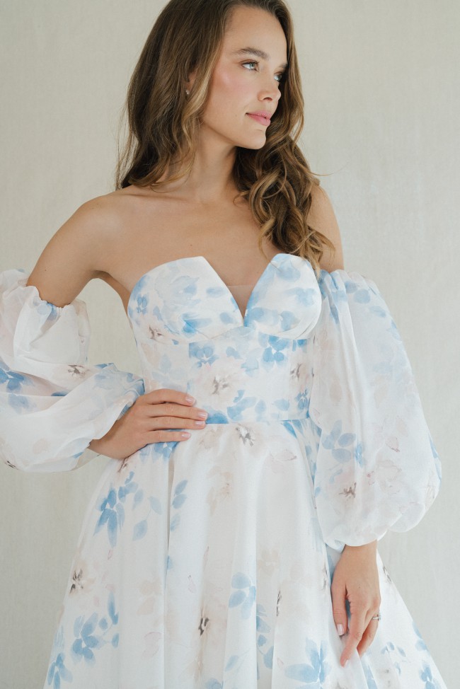 Strapless V-notch ballgown with fitted cummerbund featured in an organic watercolor print in blue, pink and ivory hues. Detachable Sleeves are not included.