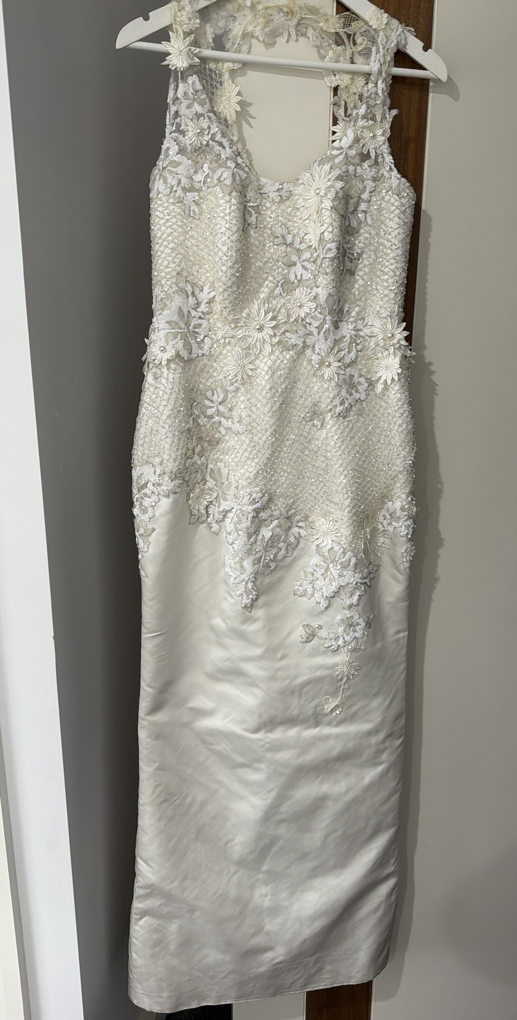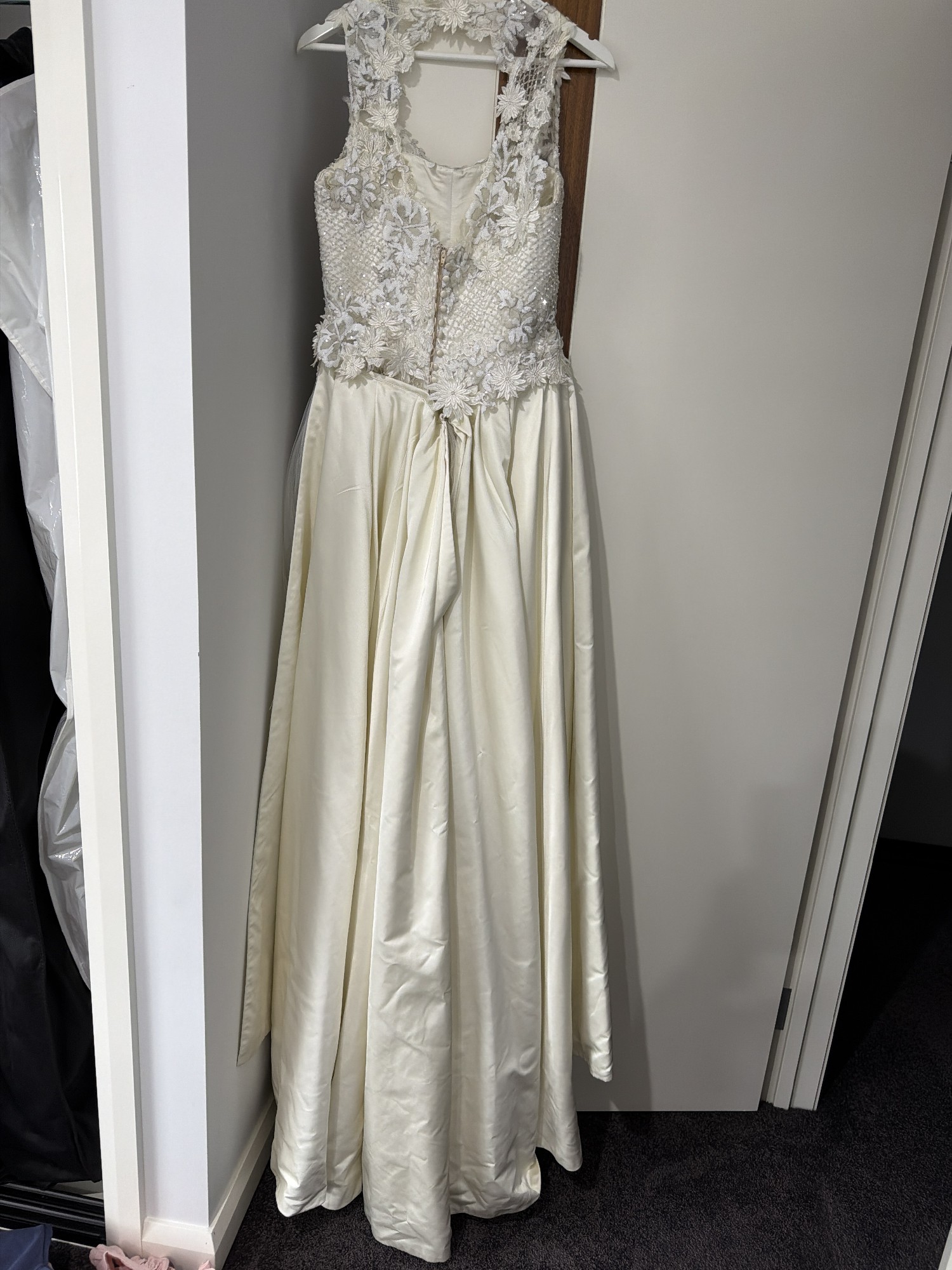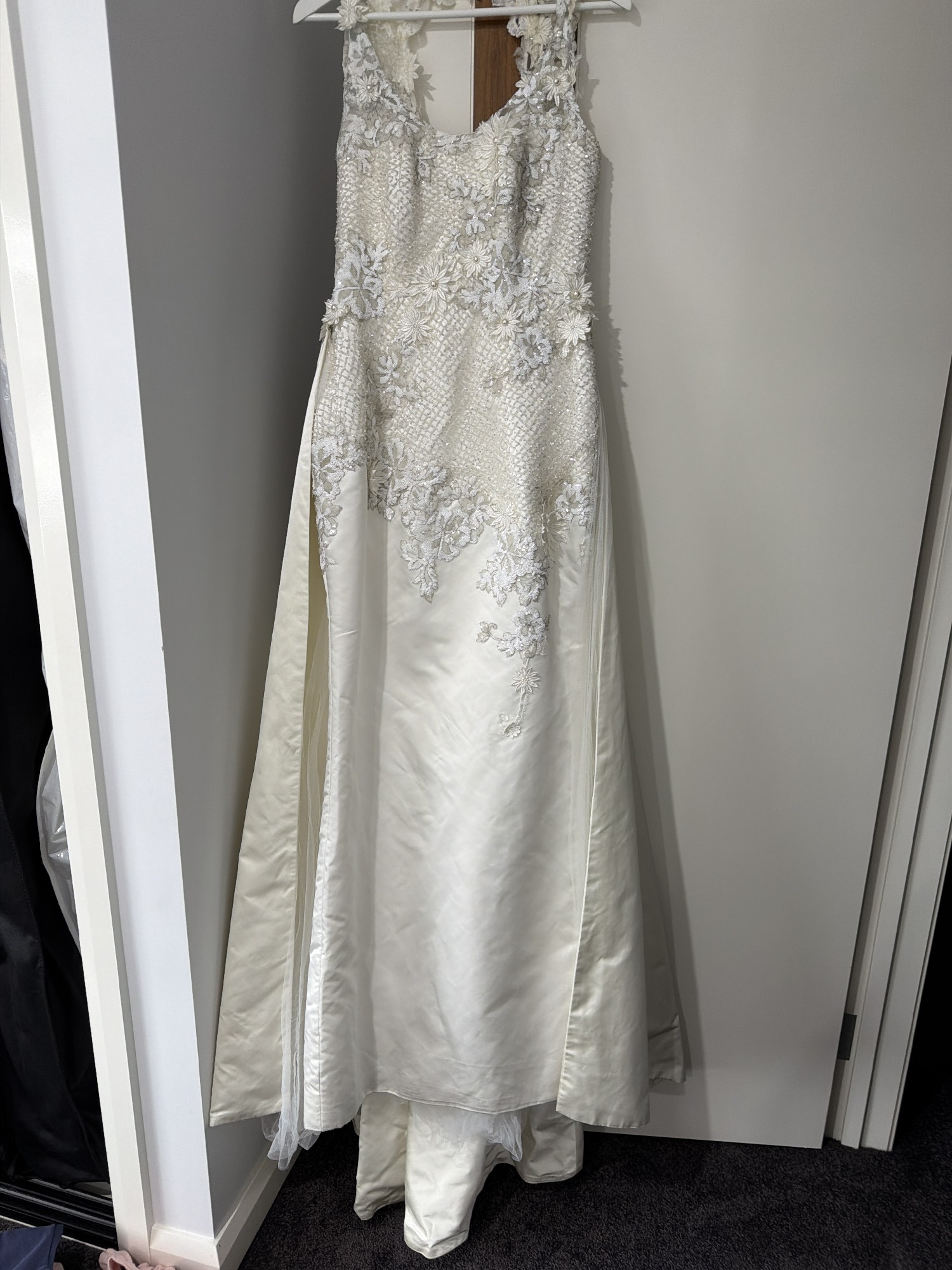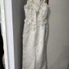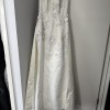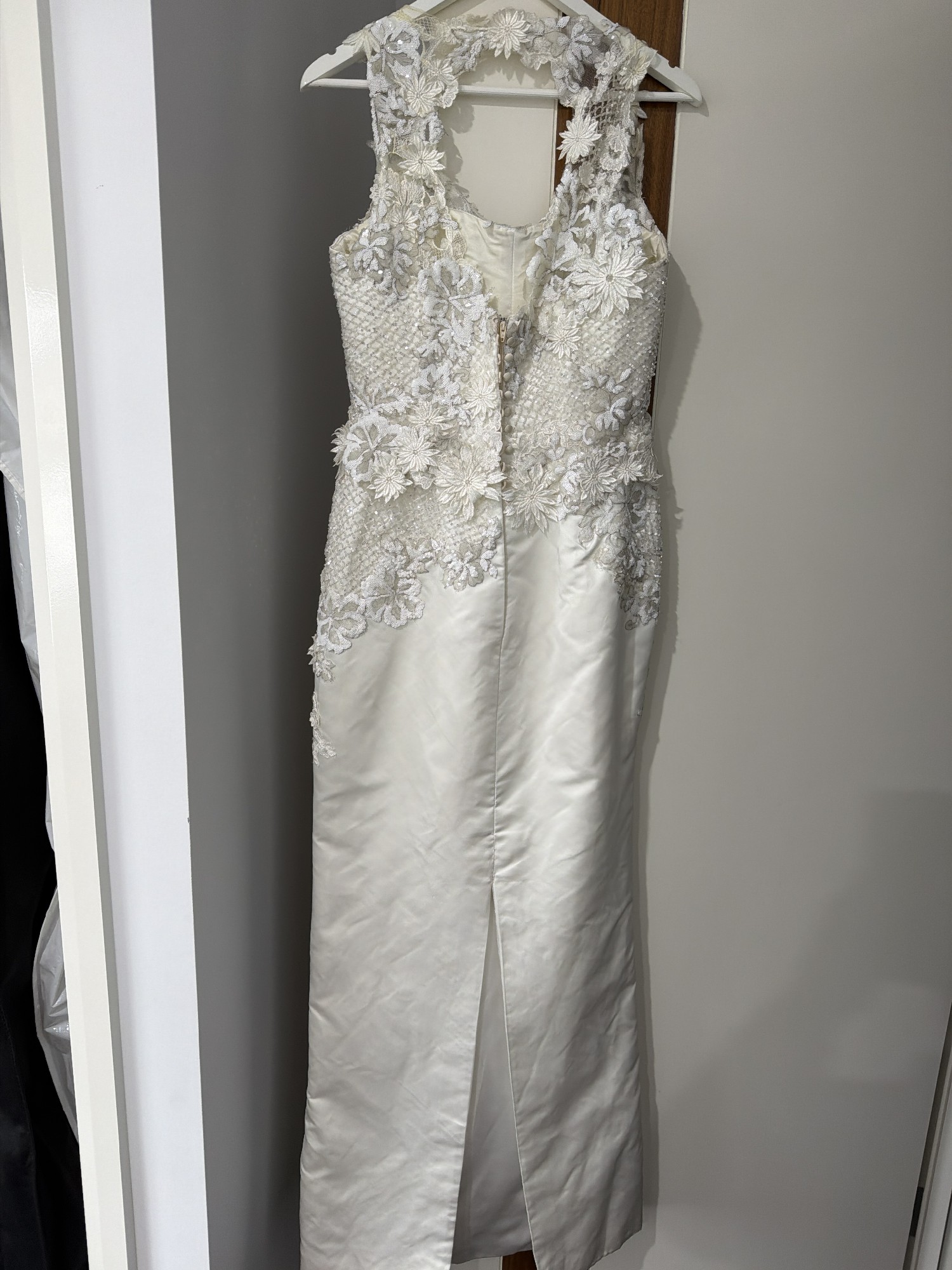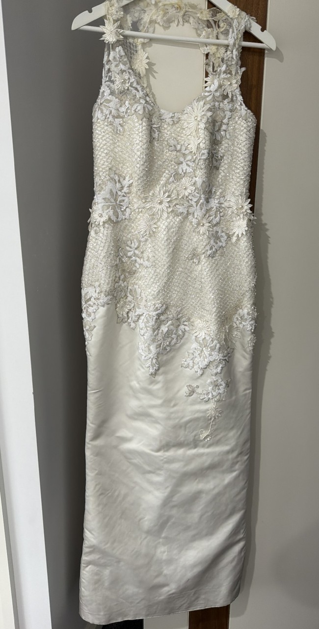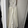 This exquisite wedding dress is a radiant reflection of my special day, and I could not be more excited to pass it on to another bride-to-be. The beautiful ivory fabric gracefully flows in a sheath silhouette, hugging the body in all the right places while maintaining an air of elegance. The scoop neckline elegantly frames the collarbone, and the keyhole back adds a touch of allure that makes this gown truly unique.