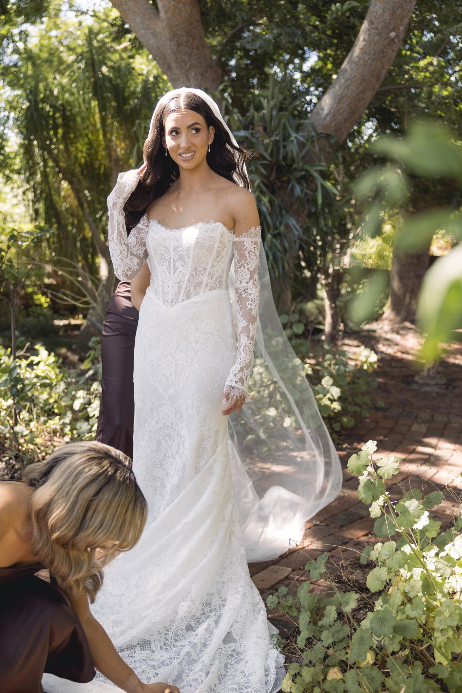 This dress was custom made by Made With Love, combining the amazing Winnie lace skirt with the elegant Romy bodice for a truly unique look. The detachable Chantilly lace sleeves give you two looks in one – perfect for ceremony and reception.