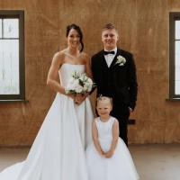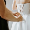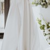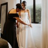 Alterations: The train was professionally shortened for ease of movement while still maintaining its elegant look. A button was added to bustle/hook the train up, perfect for the reception and dancing