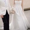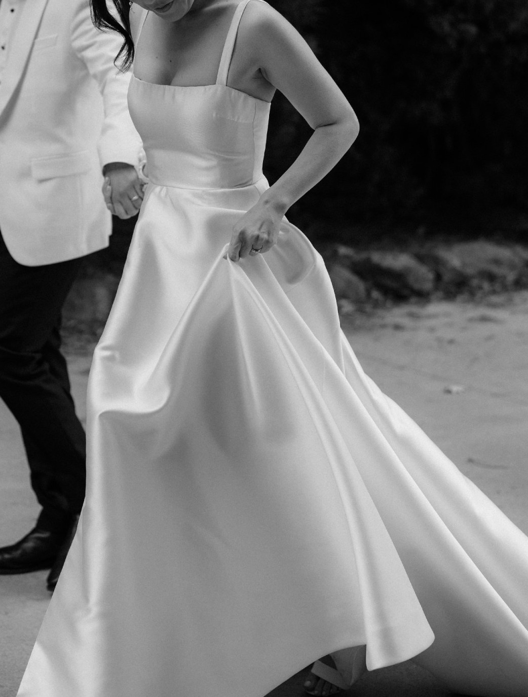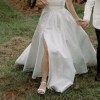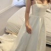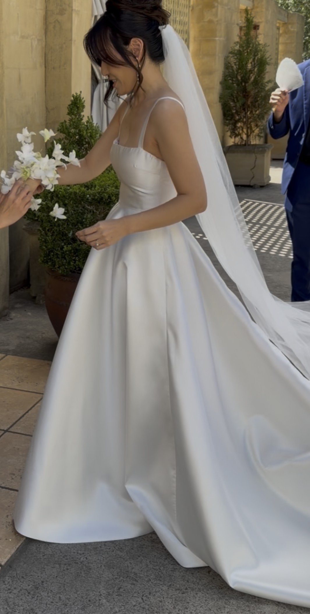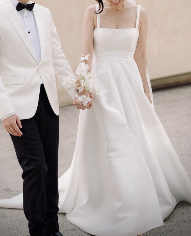 Crafted from luxurious Mikado, the gown boasts a subtle sheen that catches the light beautifully, creating stunning visual interest. The delicate straps were repositioned and sewn in for added support and a more modern look.