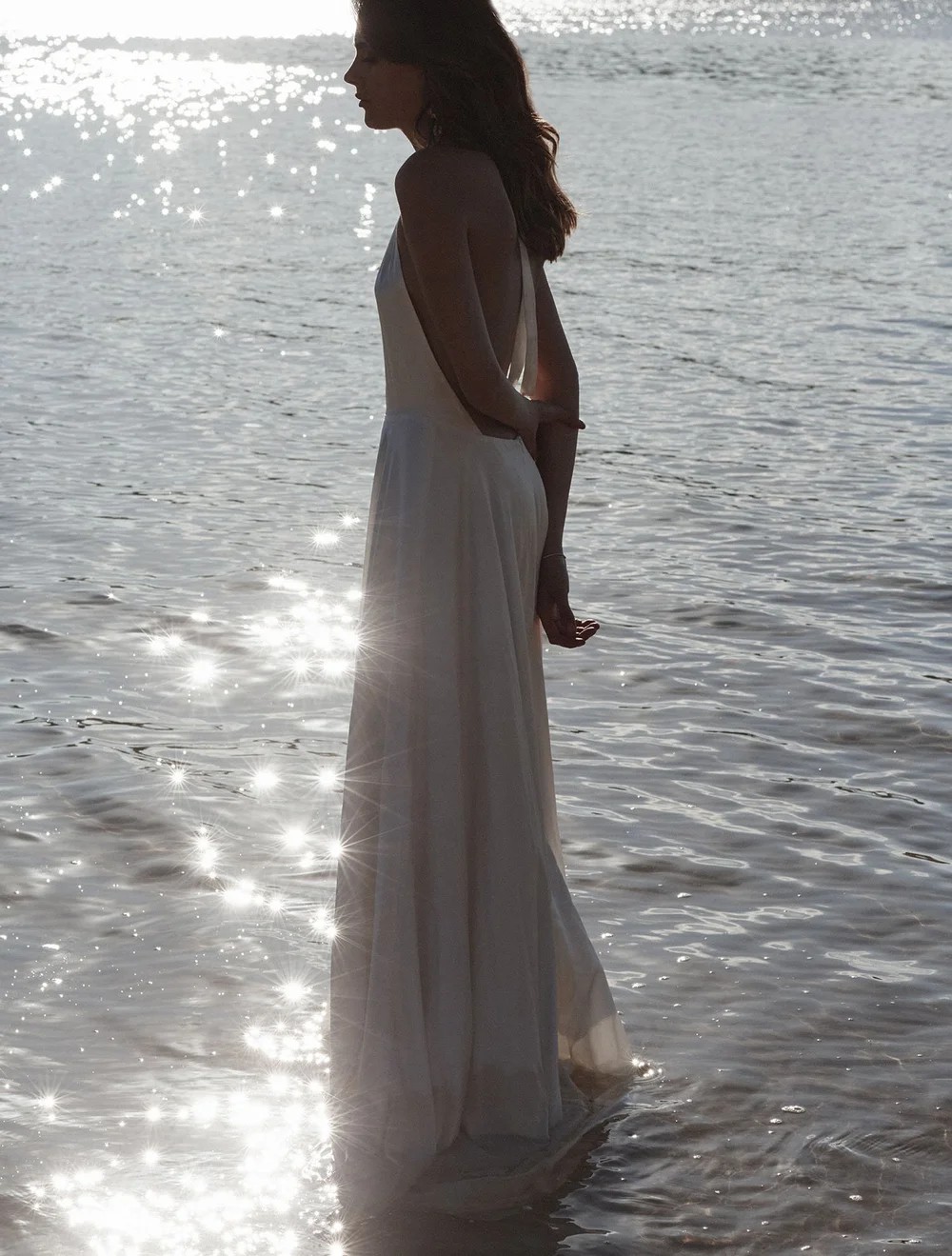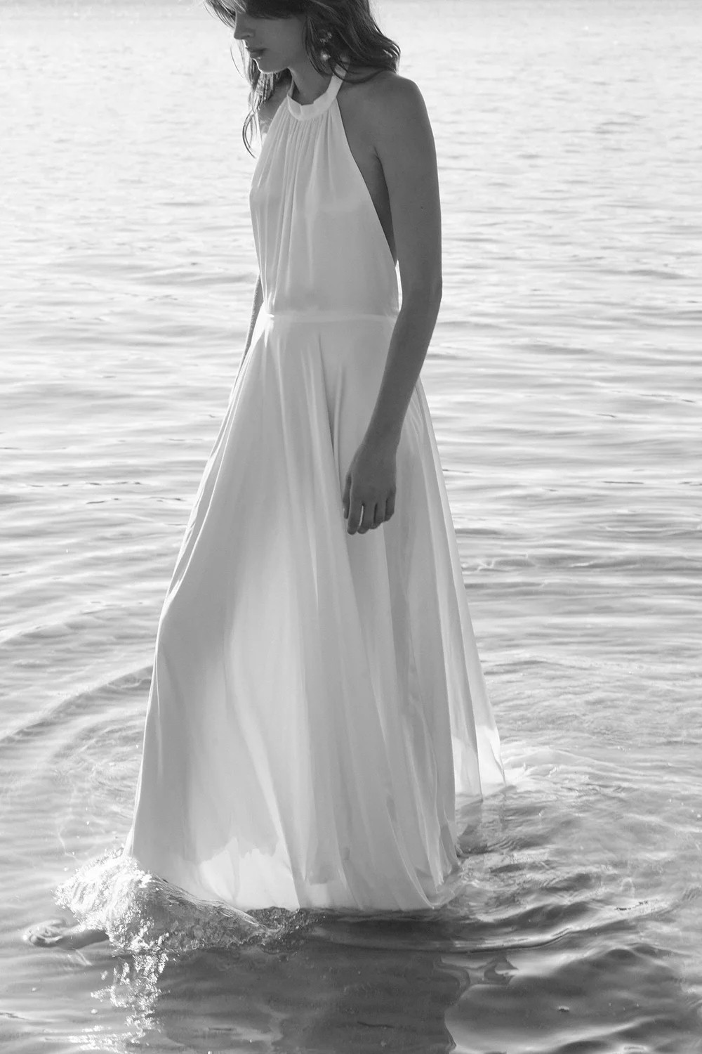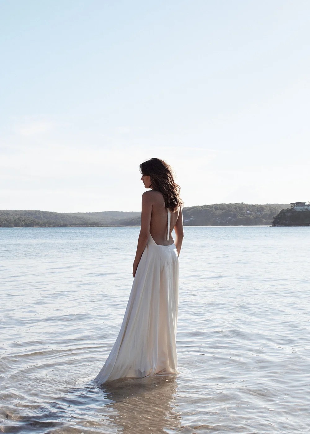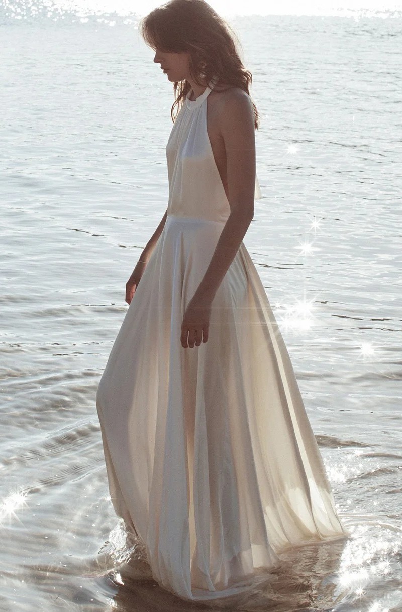 THE DETAILS: Made of luxe, buttery 100% silk, this lush silk halter gown features a full ball skirt and open back. She’s easy breezy and beautiful.