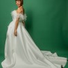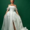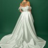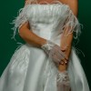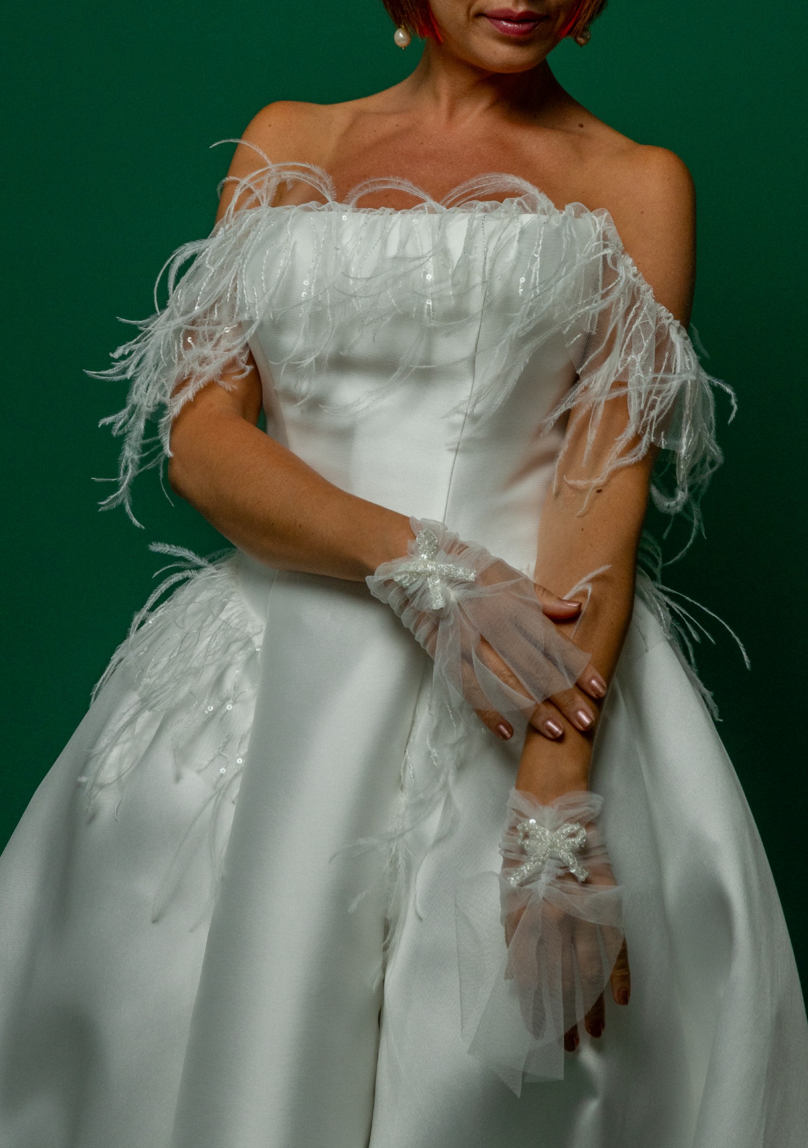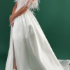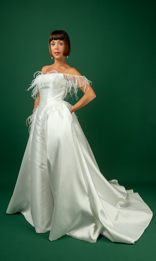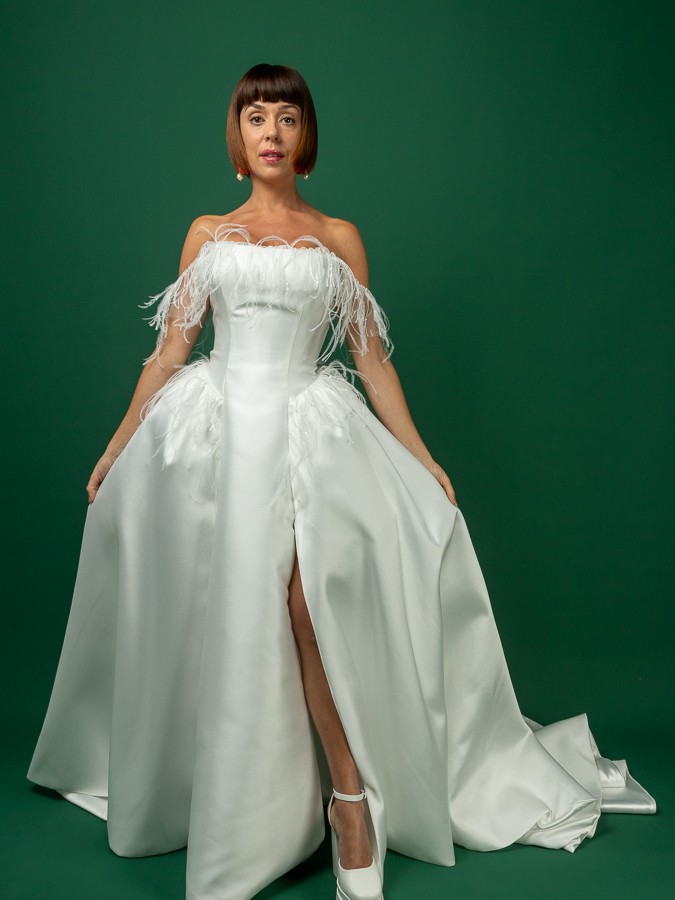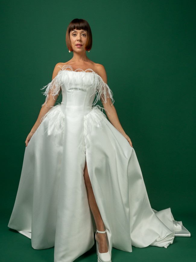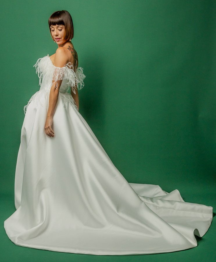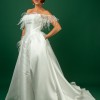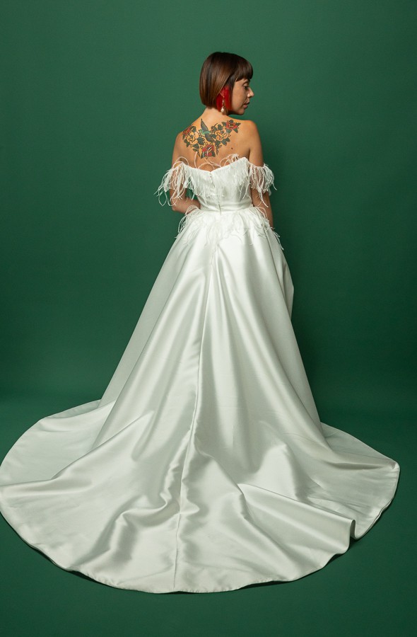 A chic ball gown is crafted from luxurious Mikado fabric and lined with light Mikado fabric. The off-shoulder straight neckline corset is adorned with flowy, weightless Ostrich feathers. The skirt has a slit and a show-stopping long train. The dress zips at the back and has an internal cinch belt for a perfect fit.