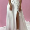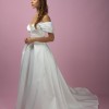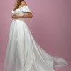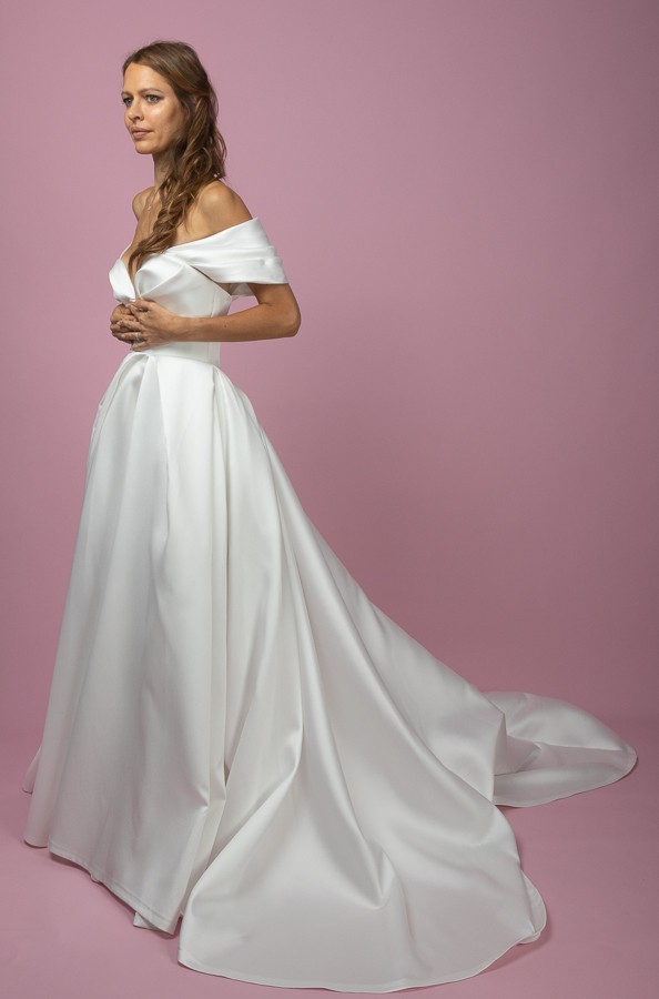 A charm ball gown is crafted from luxurious Mikado fabric. The off-shoulder heart-shaped corset is adorned with draped roses and detachable sleeves. The folded, wrapped skirt features pockets and a show-stopping long train. The dress zips at the back and has an internal belt for a perfect fit.