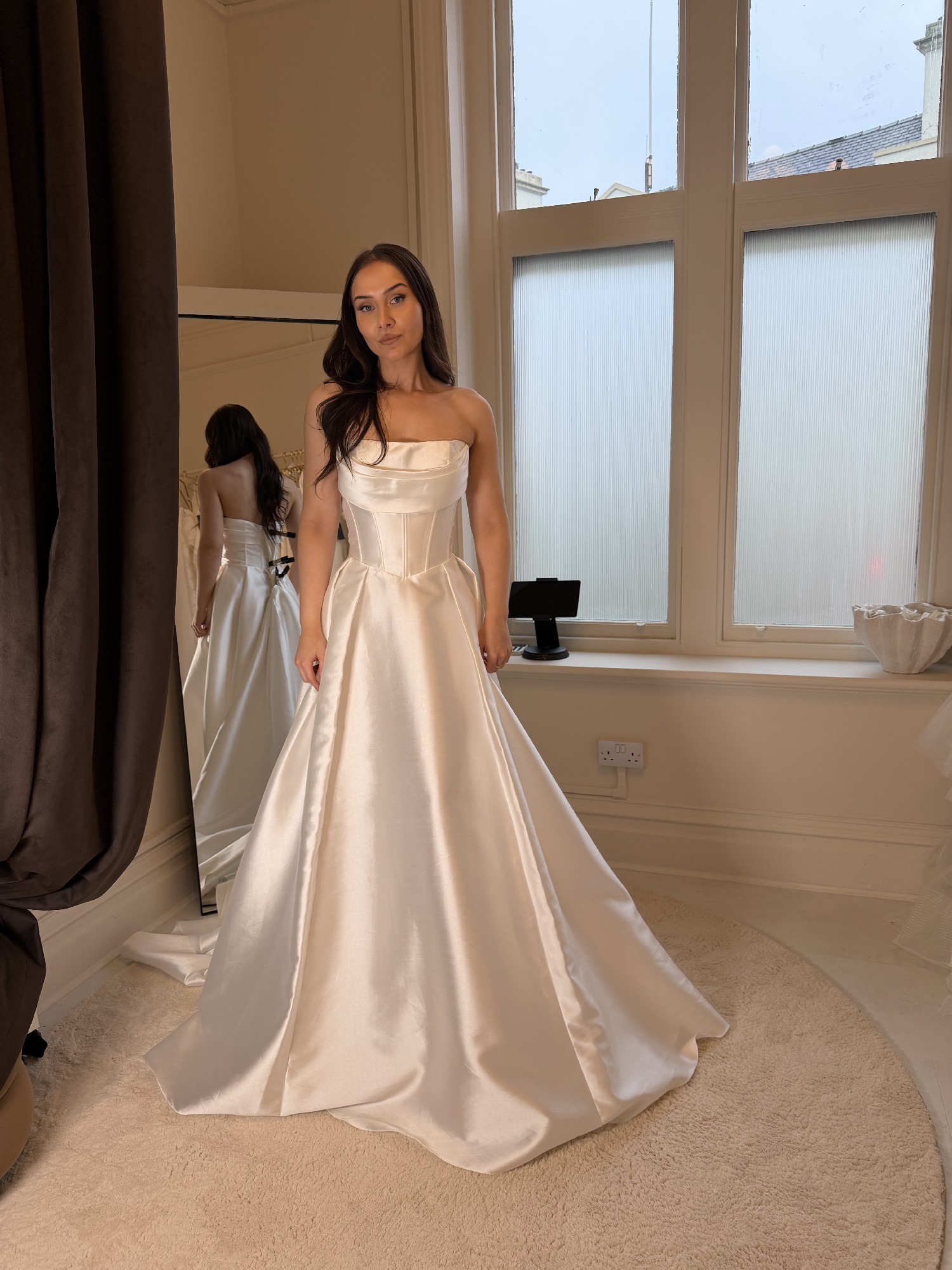 Celine's fitted, boned bodice contrasts beautifully with her voluminous skirt, crafting the perfect feminine silhouette. With the addition of optional pockets and her delicately lined button back detail, she is a vision of pure opulence and elegance.
