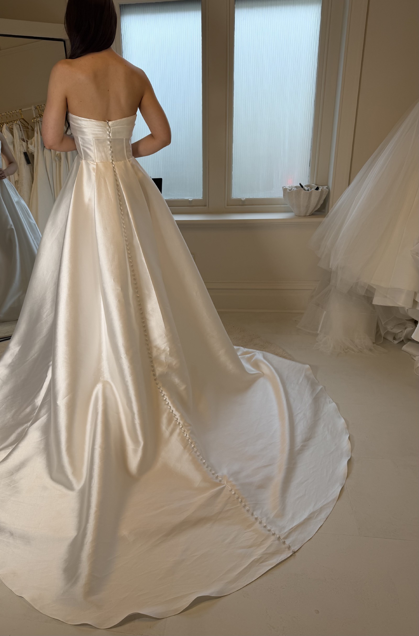 You only get married once, so make it unforgettable with our darling Celine. She is nothing less than royalty. Her elegant drop waist, luxurious full pleated Mikado skirt and intricate corset-like bodice details are something straight from a fairytale.