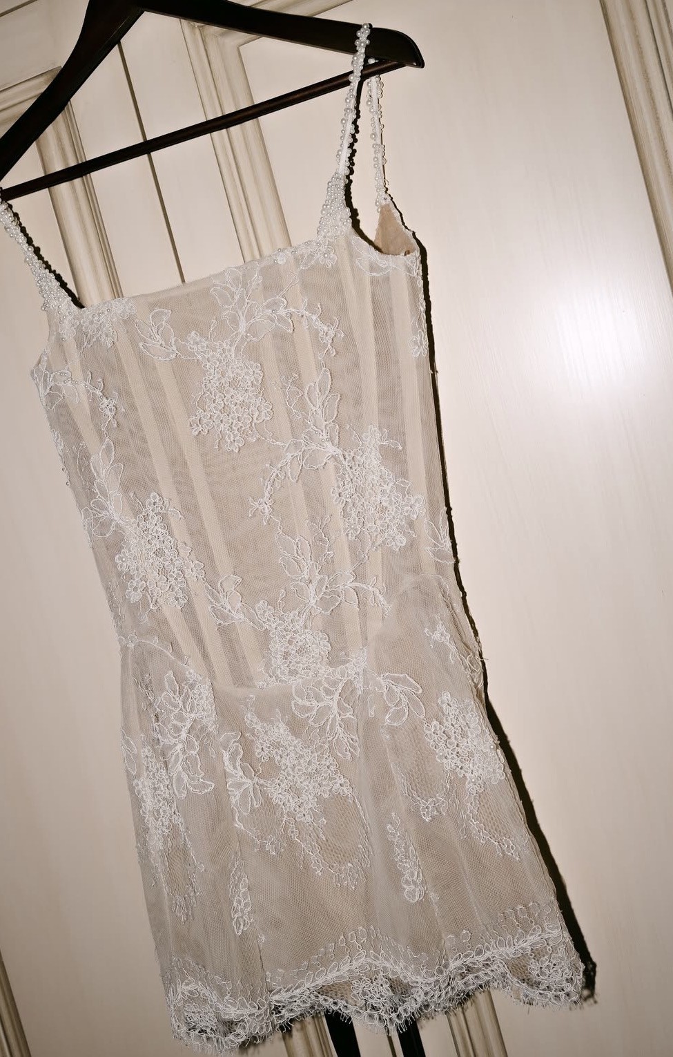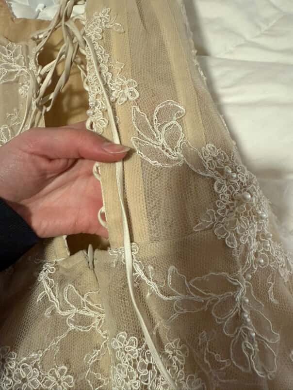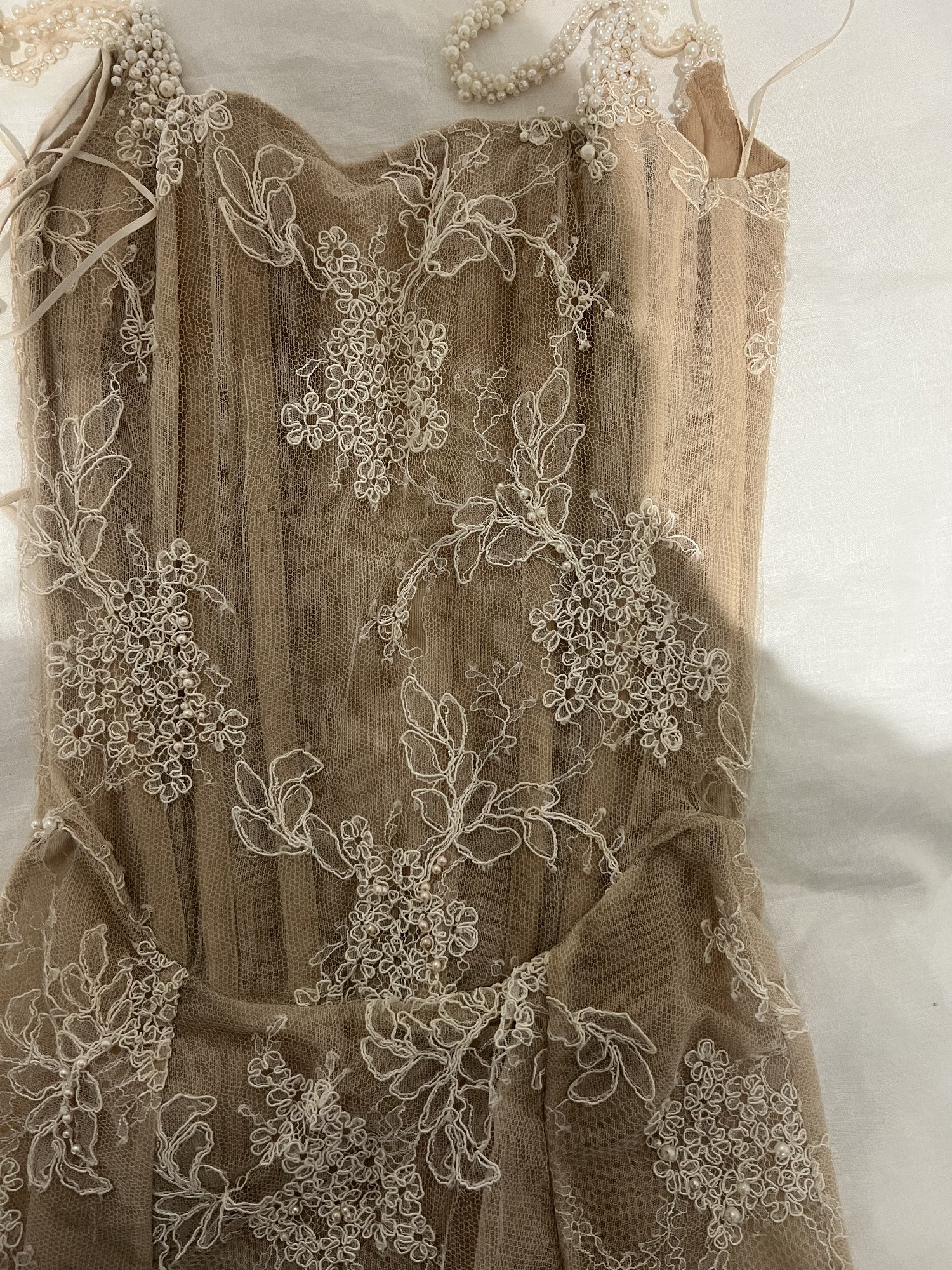 Handmade Kate Willa Rachel mini lace beaded dress, with boning and tie back.