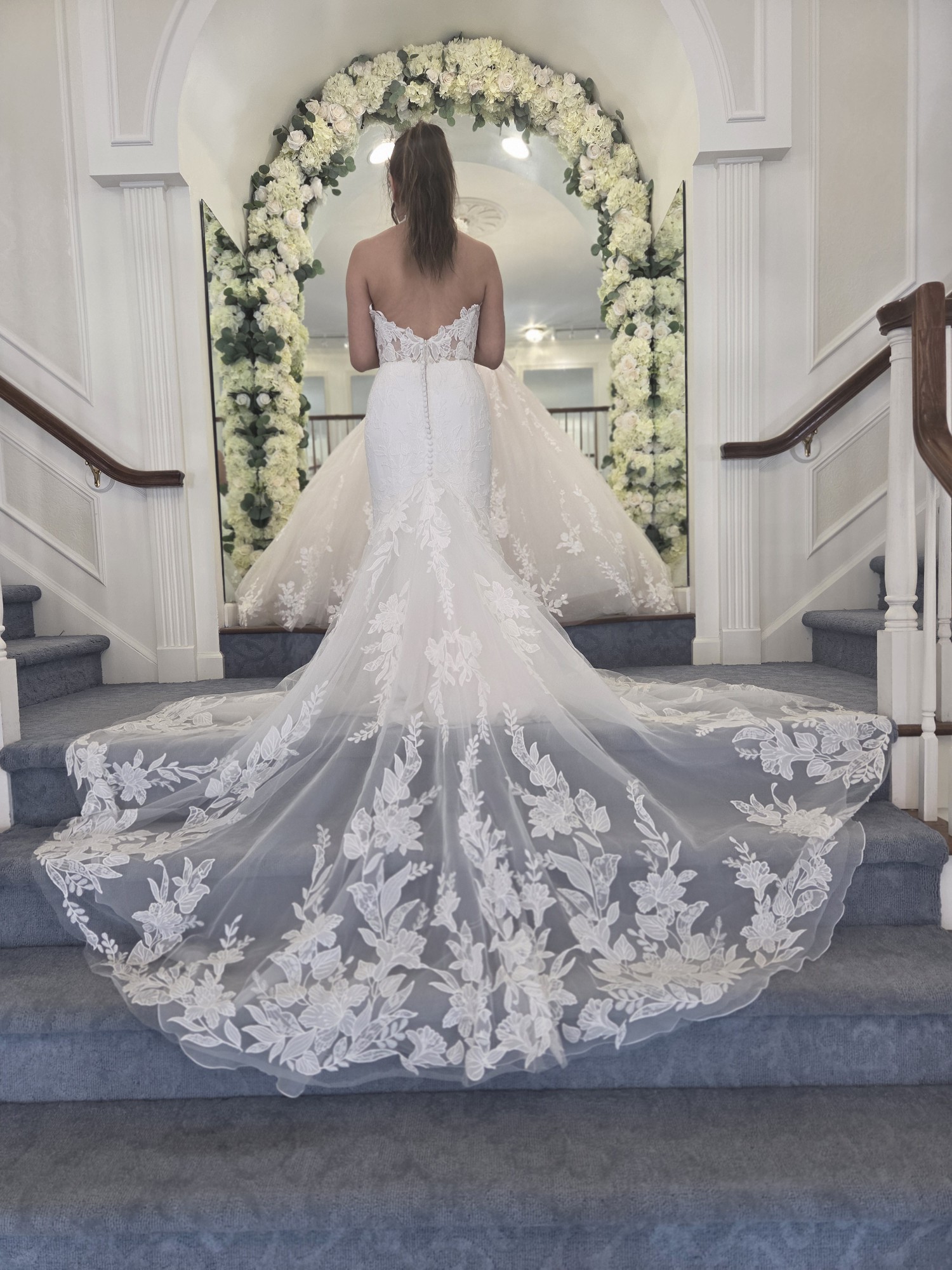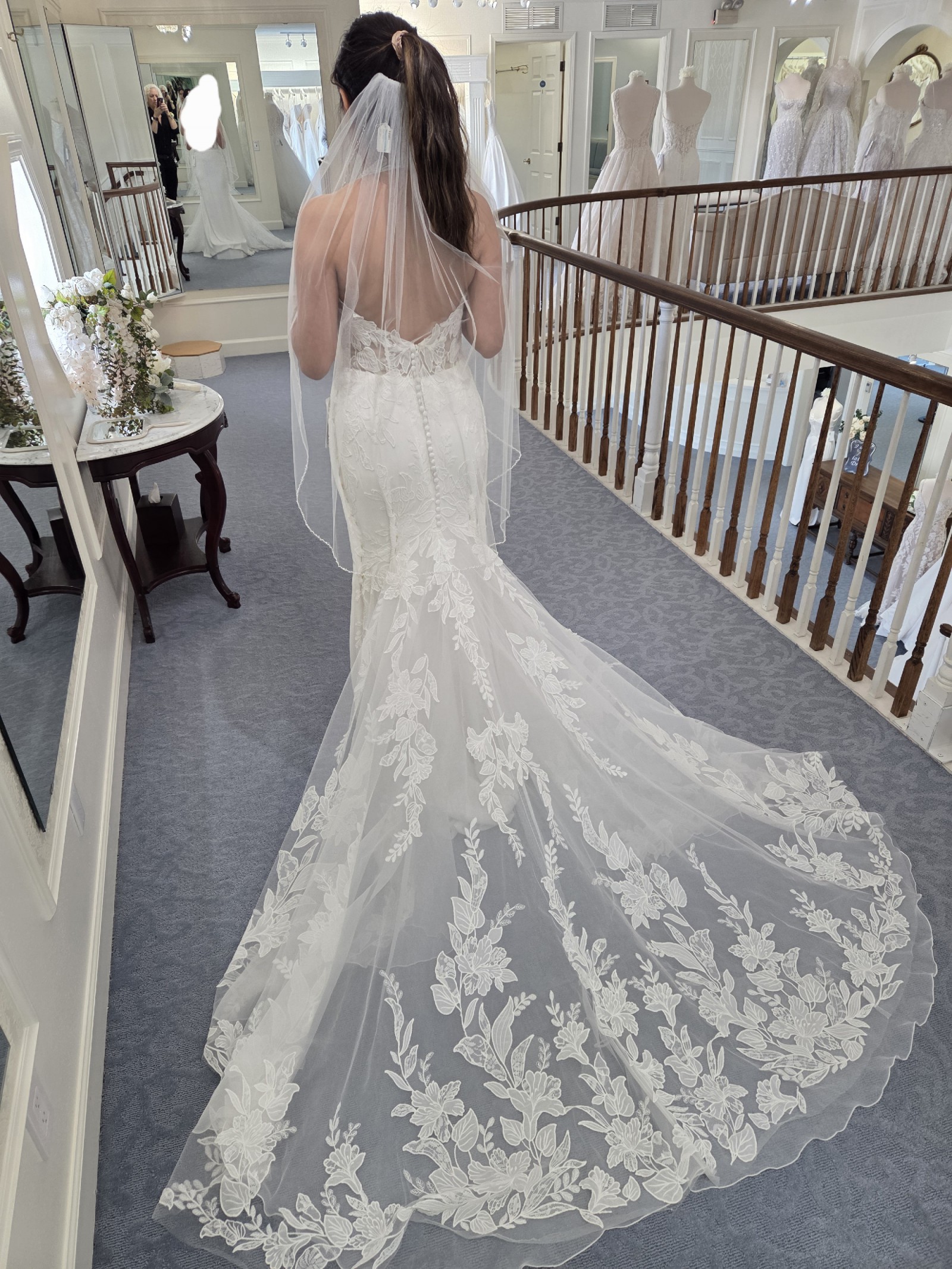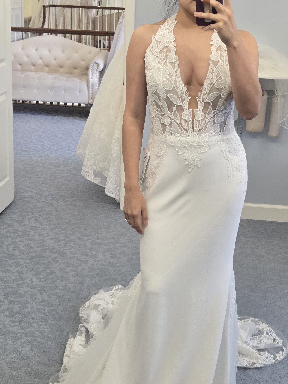 *** This dress is a size 10 in bridal sizing. Never worn. *** This is a beautiful dress!! Unfortunately I bought off the rack and alterations are not possible for my pettite frame. No returns to the birdal store.