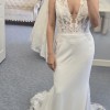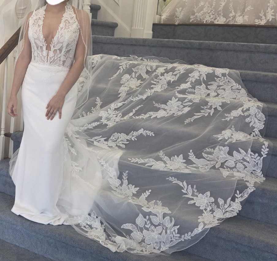 Perfect choice for the modern bride who desires elegance with a twist. The figure-hugging silhouette enhances your natural curves, flowing seamlessly from a flattering V-neckline to a romantic backless design. Its airy and feminine.