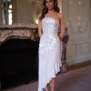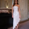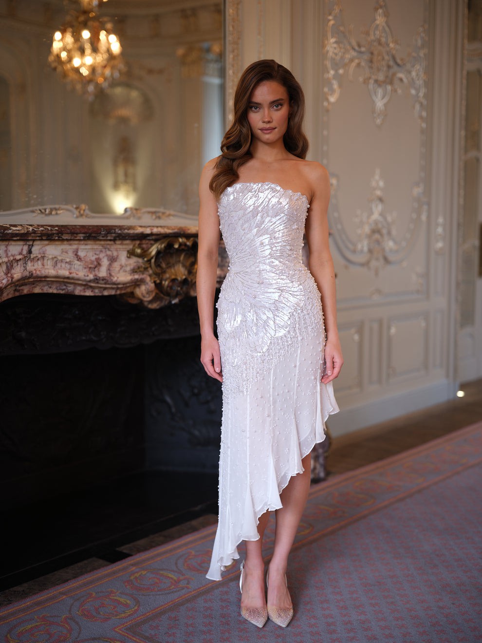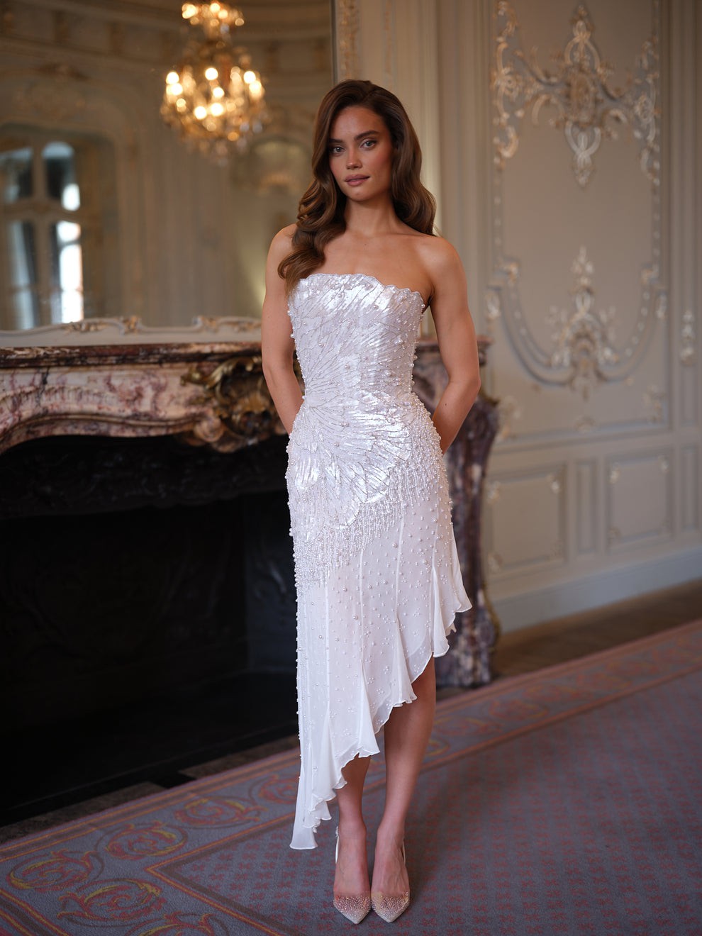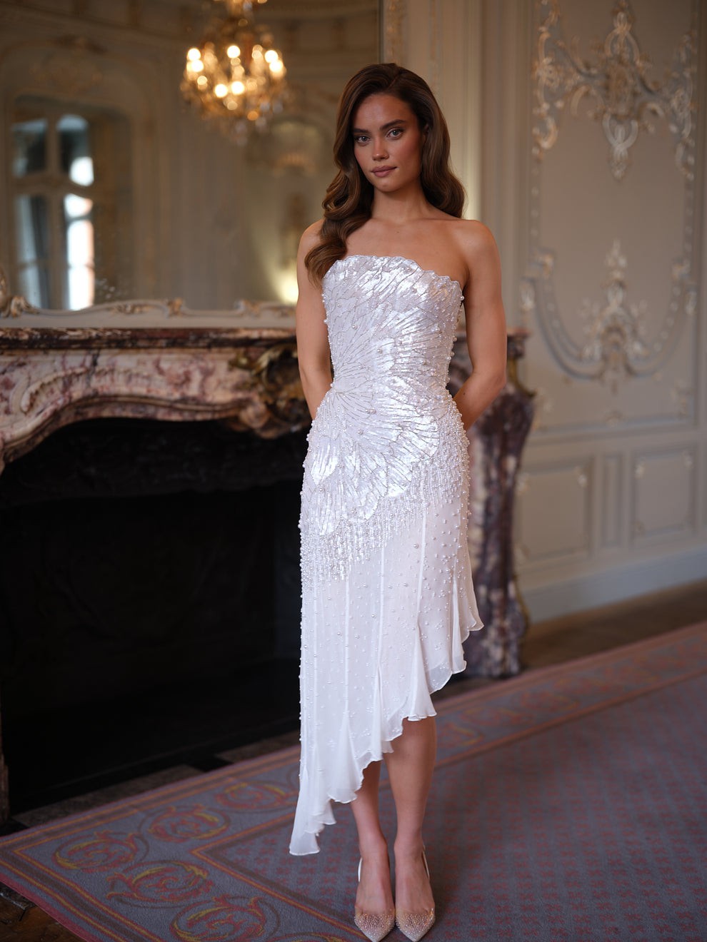 The flowing chiffon skirt drapes effortlessly, designed to float and move with each step. An asymmetric hemline enhances the sense of movement, adding a contemporary edge to the romantic silhouette while elongating the leg.