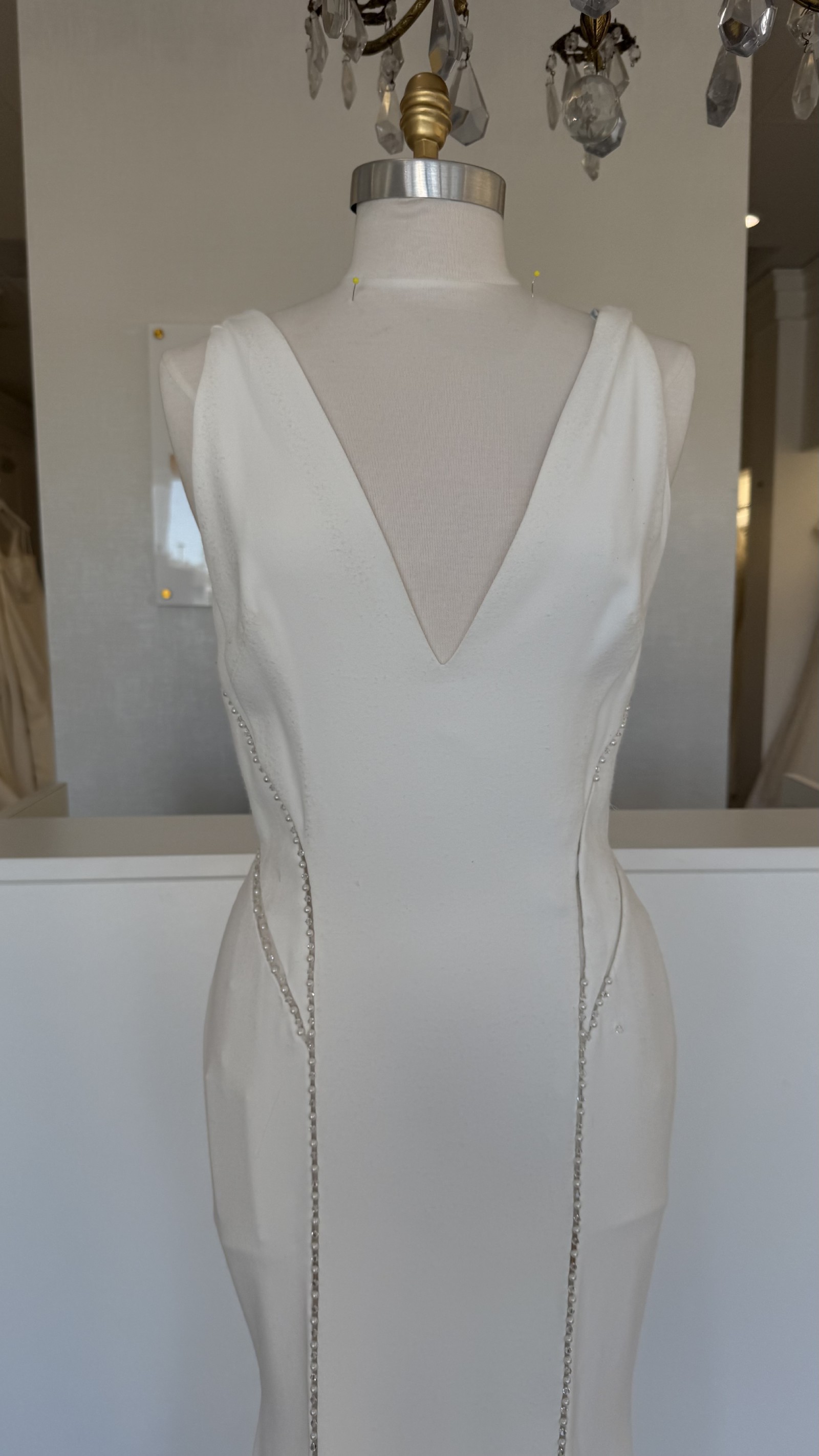 The elegant V-neckline frames your face beautifully while accentuating your figure, and the backless design adds a daring touch that exudes confidence and grace.