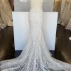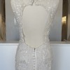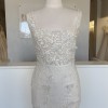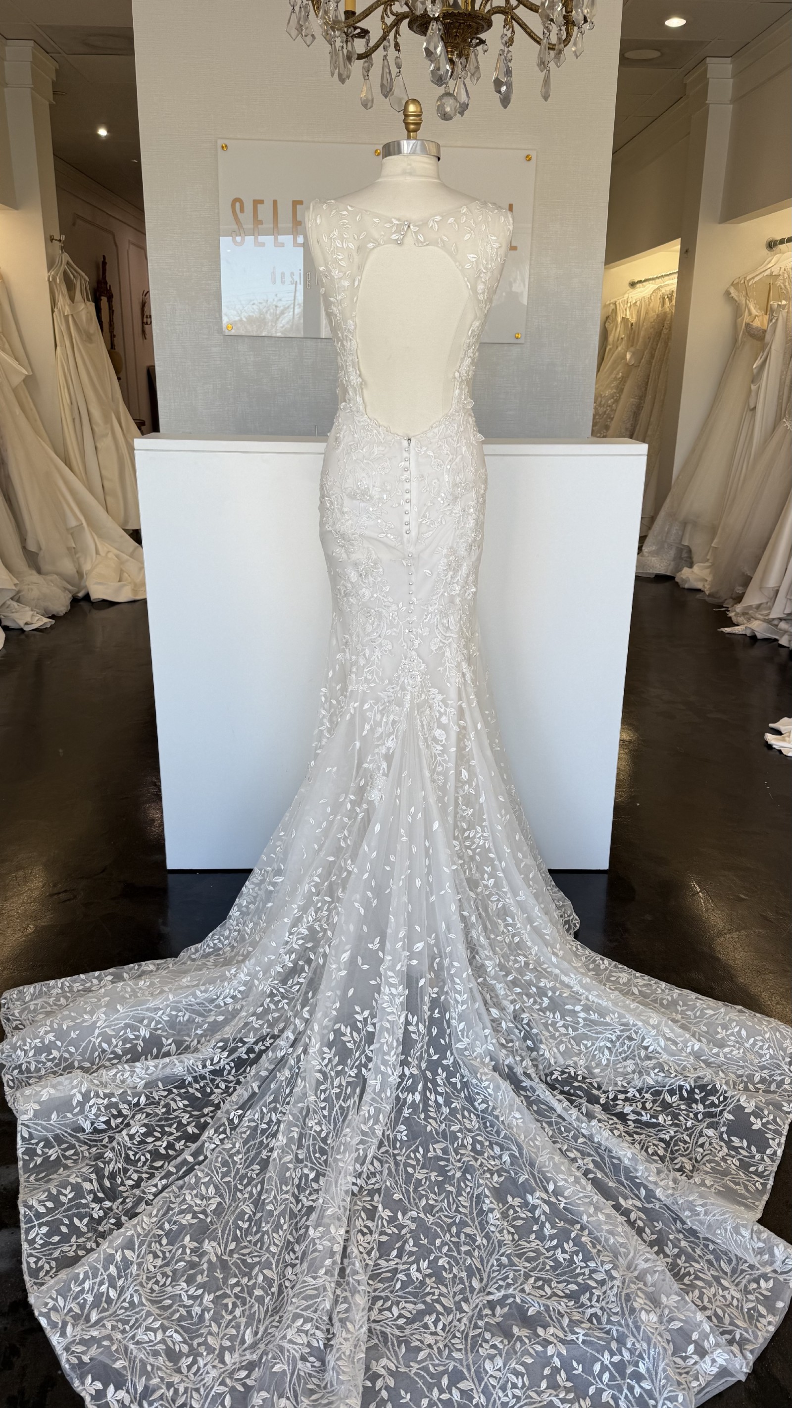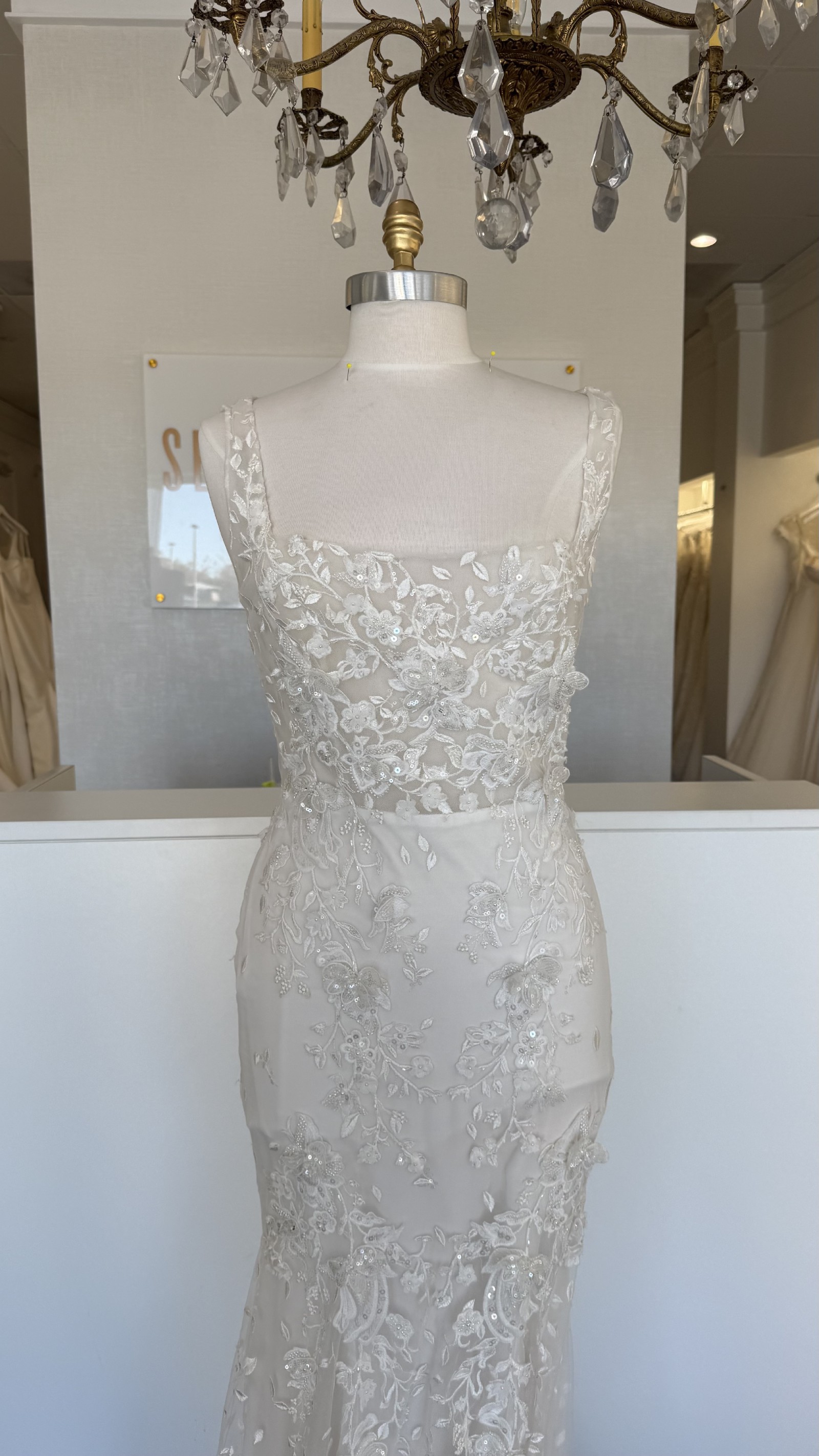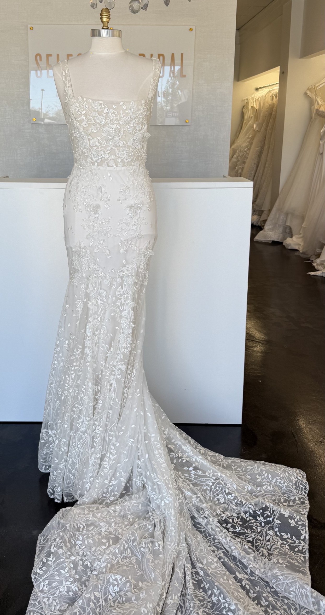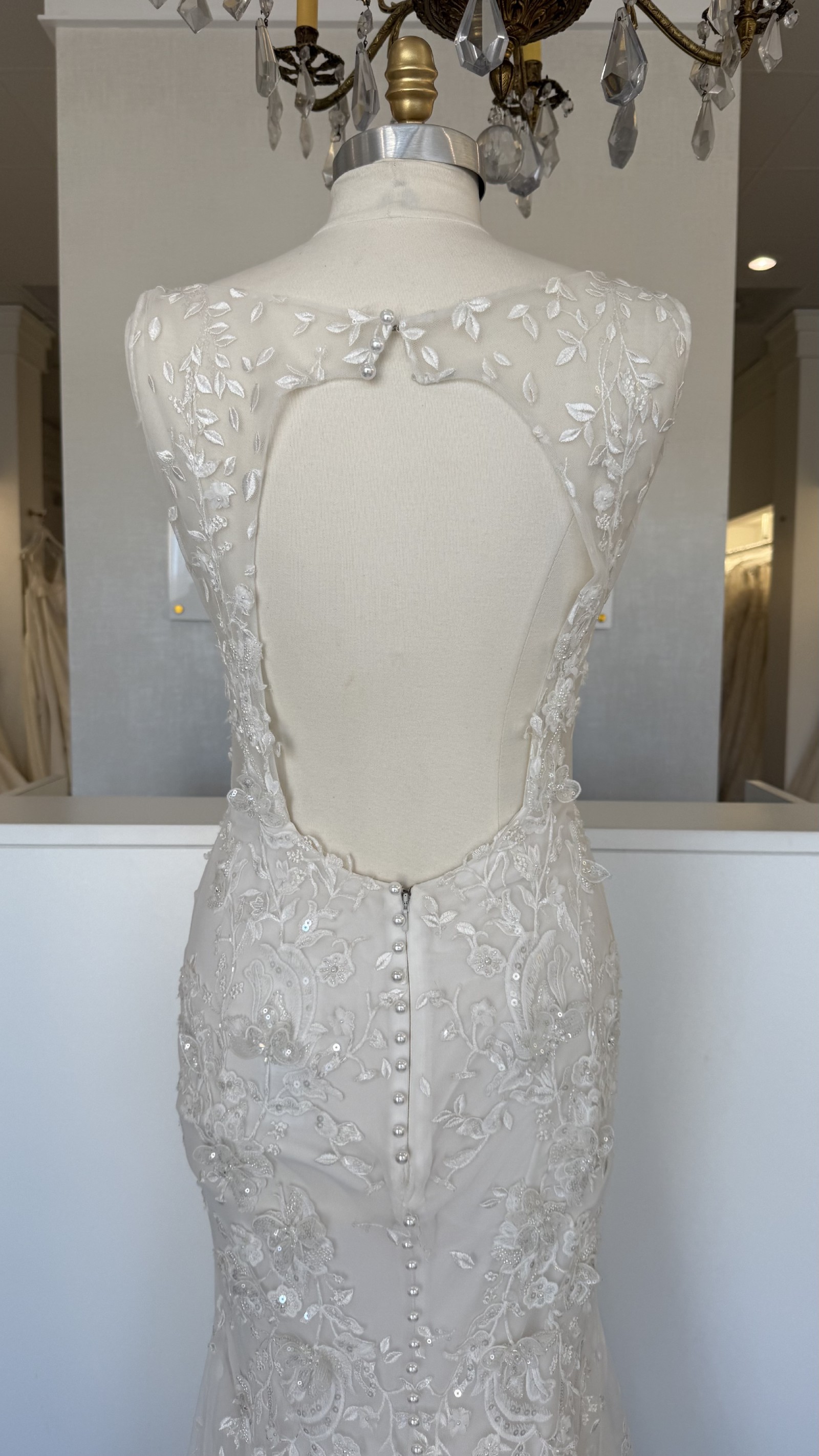 What truly sets this dress apart are the exquisite 3D flowers that cascade gently across the fabric, adorned with pearls and delicate beading that catch the light perfectly. The keyhole back adds a hint of drama and allure, making it just as stunning from behind as it is from the front. Floor-length and breathtaking, this dress was designed for the bride who wants to make a statement while feeling comfortable and confident.