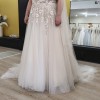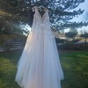 This enchanting Colby John C170 wedding dress with matching finger tip veil is a dream come true for any bride seeking elegance and romance. With its soft cream tulle, it offers a beautifully flattering A-line silhouette that gracefully flows from the waist, creating an ethereal look that is both timeless and contemporary. The V-neckline accentuates the décolletage while the delicate, low back adds an alluring touch, ensuring you feel your most stunning as you walk down the aisle.