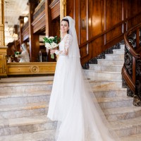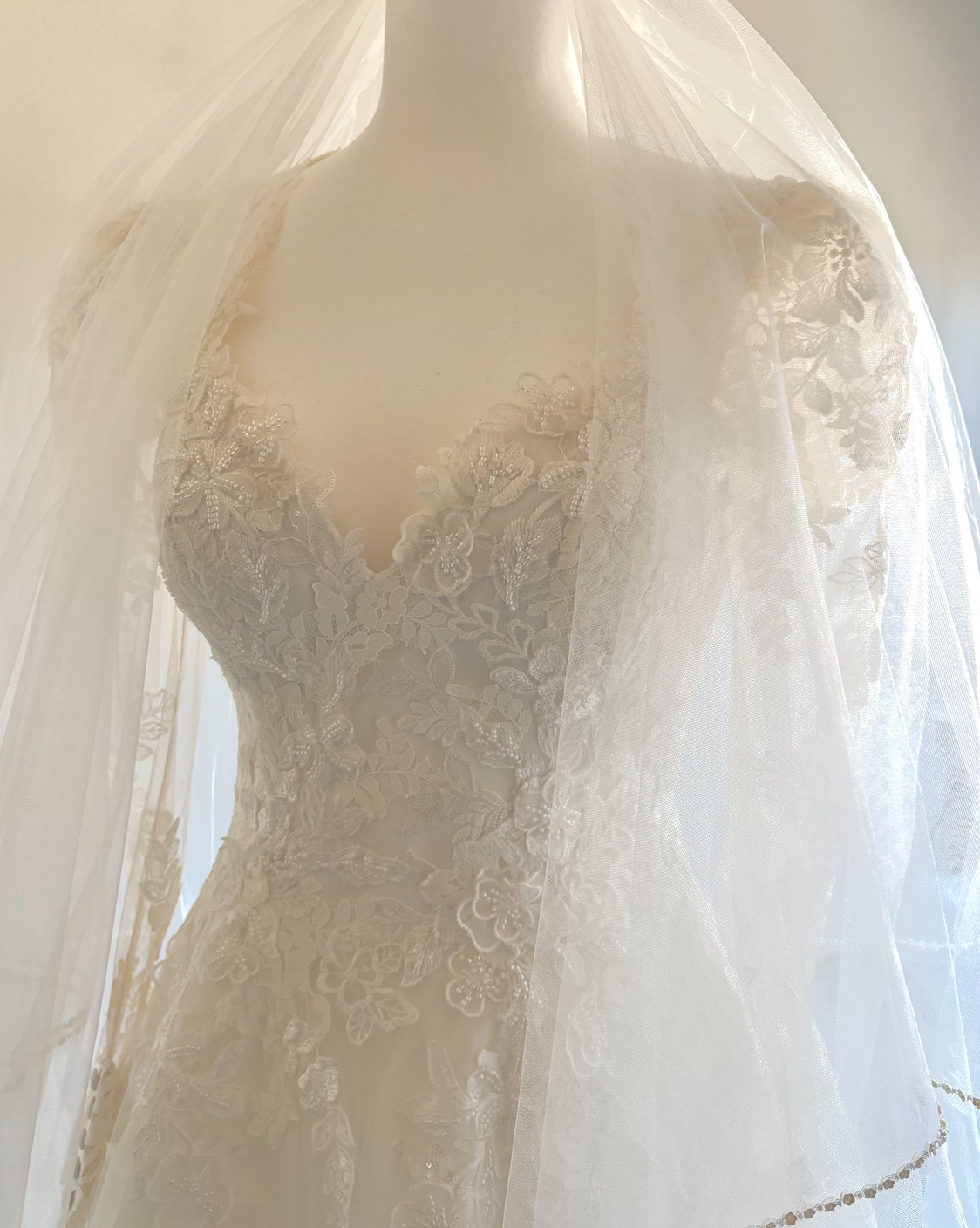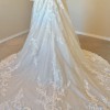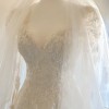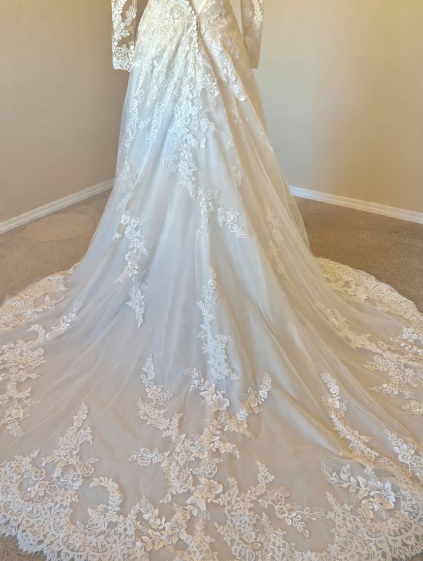 The silhouette is timeless and feminine. The lace is finely crafted, and the cathedral train lends a quiet sense of grace with every step. The skirt is composed of five layers, giving it beautiful movement and fullness while remaining light and balanced. It feels dignified and serene — romantic in a calm and confident way.