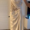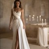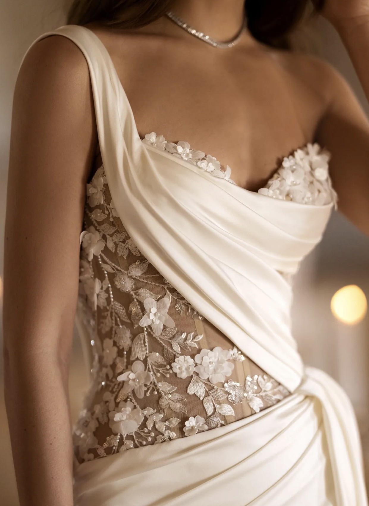 Experience the epitome of elegance with this alluring sheath wedding dress. The transparent corset, adorned with exquisite floral appliques, creates a captivating and romantic effect. With its one asymmetrical strap and decorative elements crafted from glossy fabric, this dress exudes sophistication and charm. The wrap skirt gracefully cascades, adding a touch of whimsy and movement to your every step. To showcase your confidence and style, a high slit on the leg adds a hint of allure. Be prepared to make a statement and leave a lasting impression as you walk down the aisle in this captivating wedding gown.