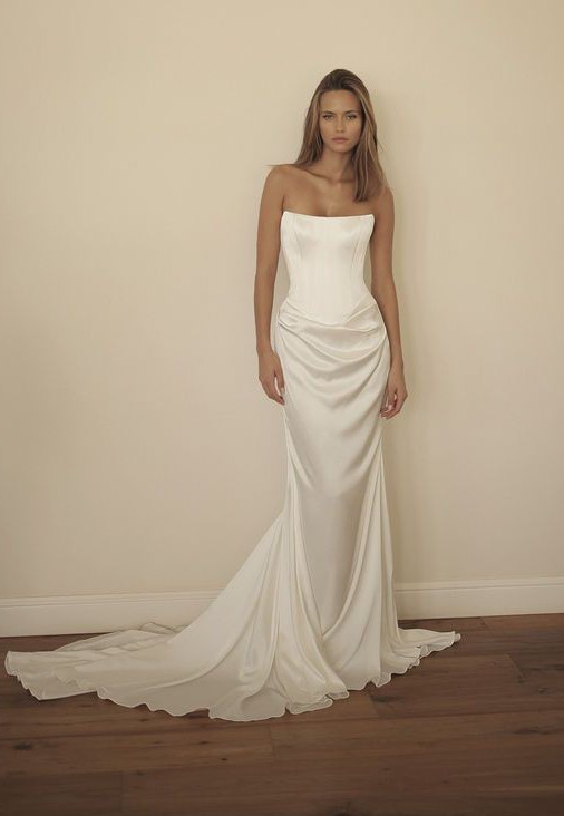Elegant strapless Dalia gown by Lihi Hod featuring a structured dropped waist and flattering fitted silhouette. Made from luxurious silk with beautiful gathering detail at the waist for soft dimension and shape. Classic, timeless, and impeccably tailored.
