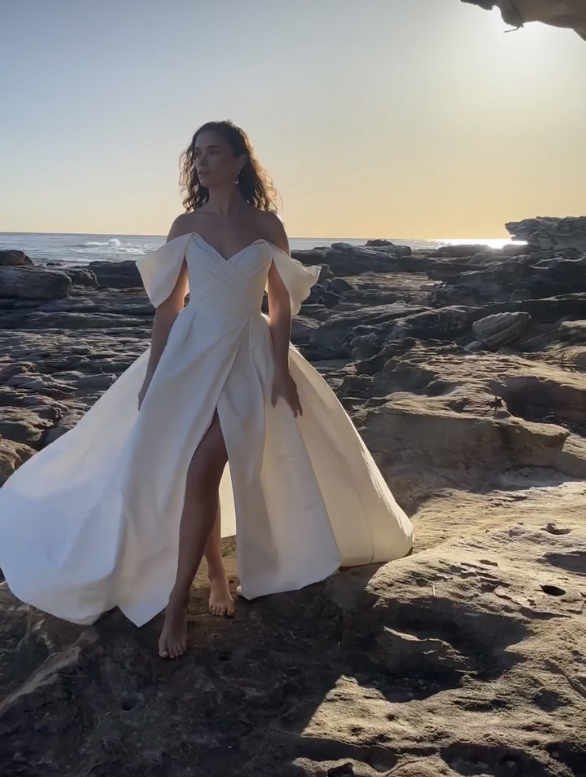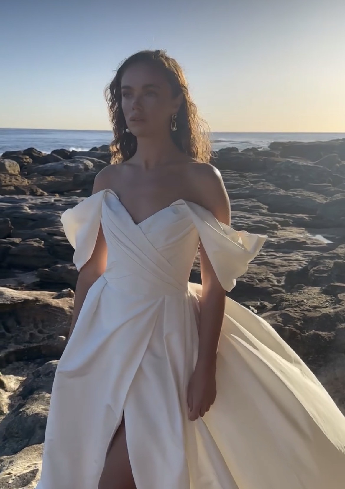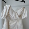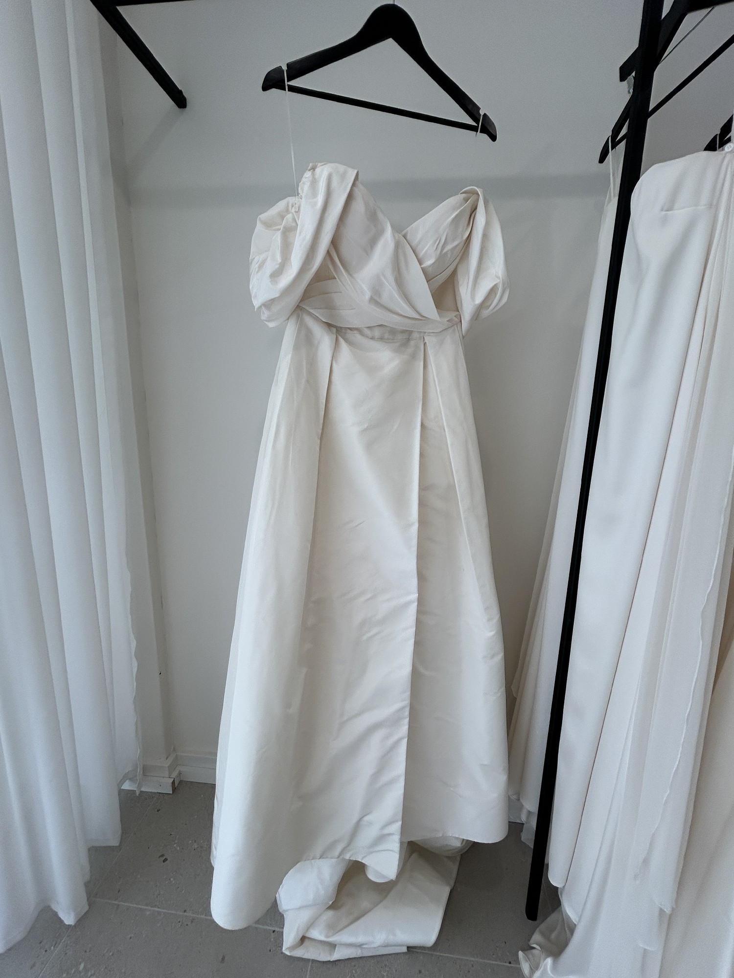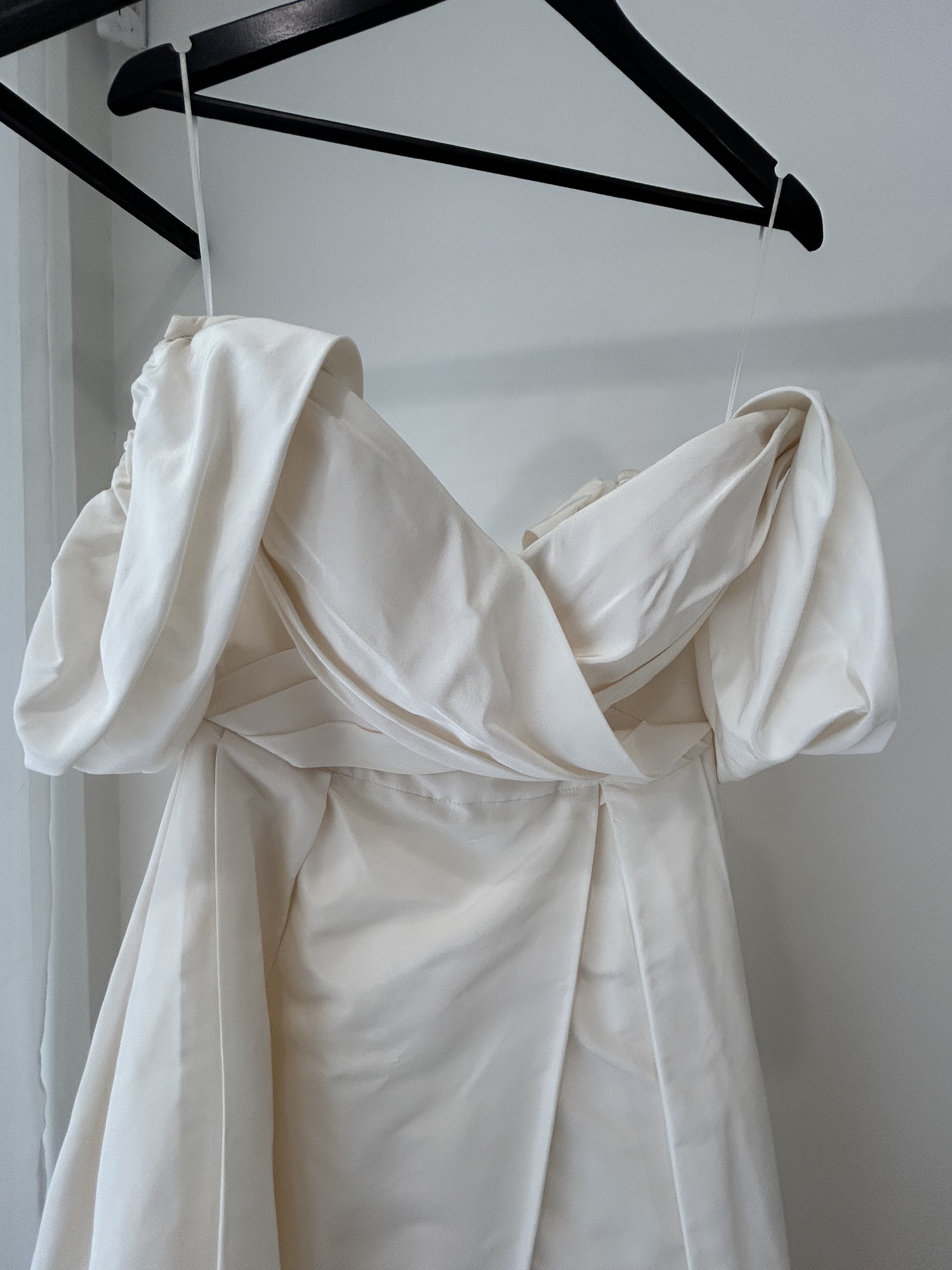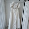 Stella, a timeless classic with a contemporary twist. Stella reimagines traditions. The luxurious silk taffeta mikado fabric looks stunning both still and in motion. Our sample includes detachable flutter sleeves and comes in a light ivory. Featuring internal boning, this gown is super light weight. You Dan wear this gown with the flutter sleeves as pictured, however they are completely detachable if you prefer a strapless look.