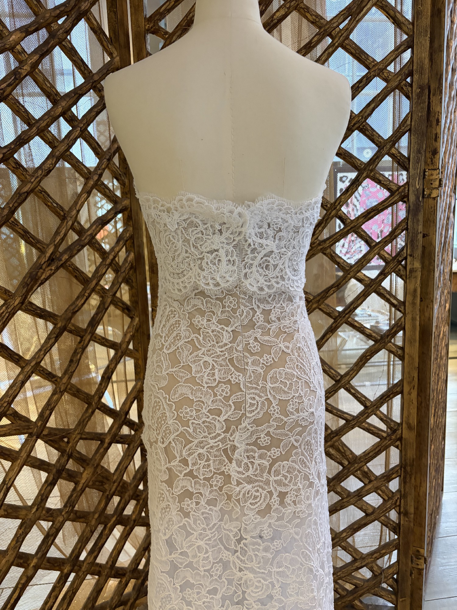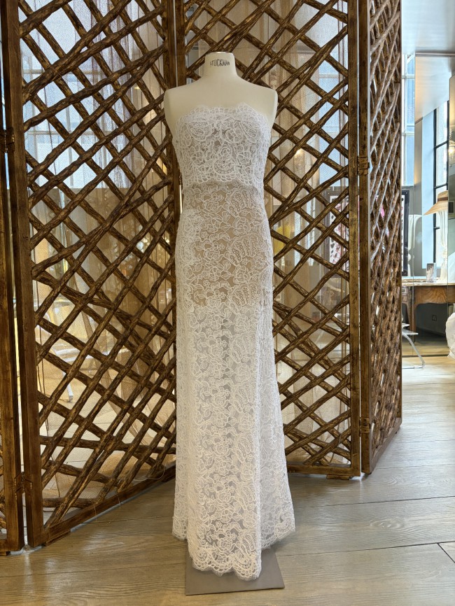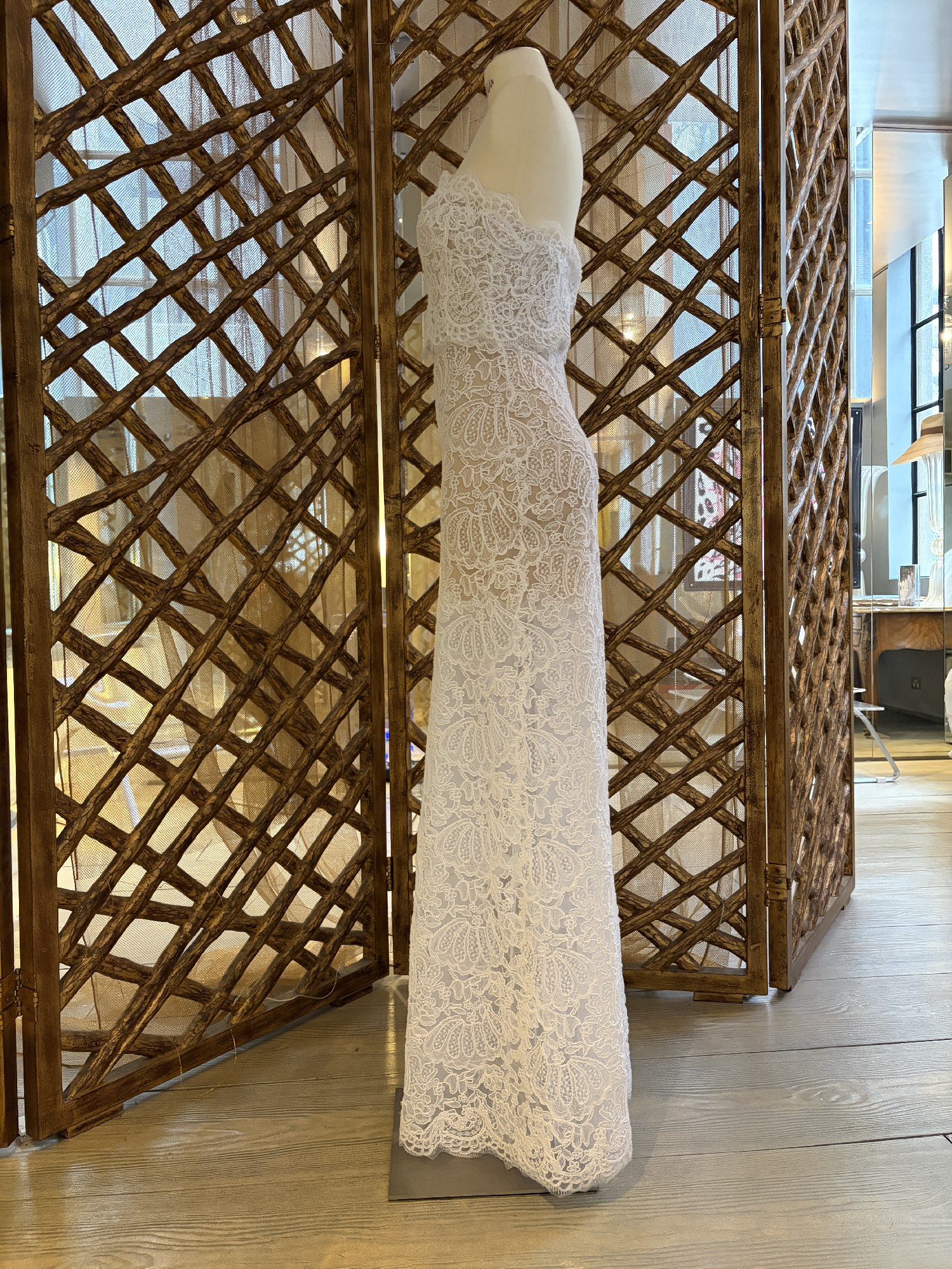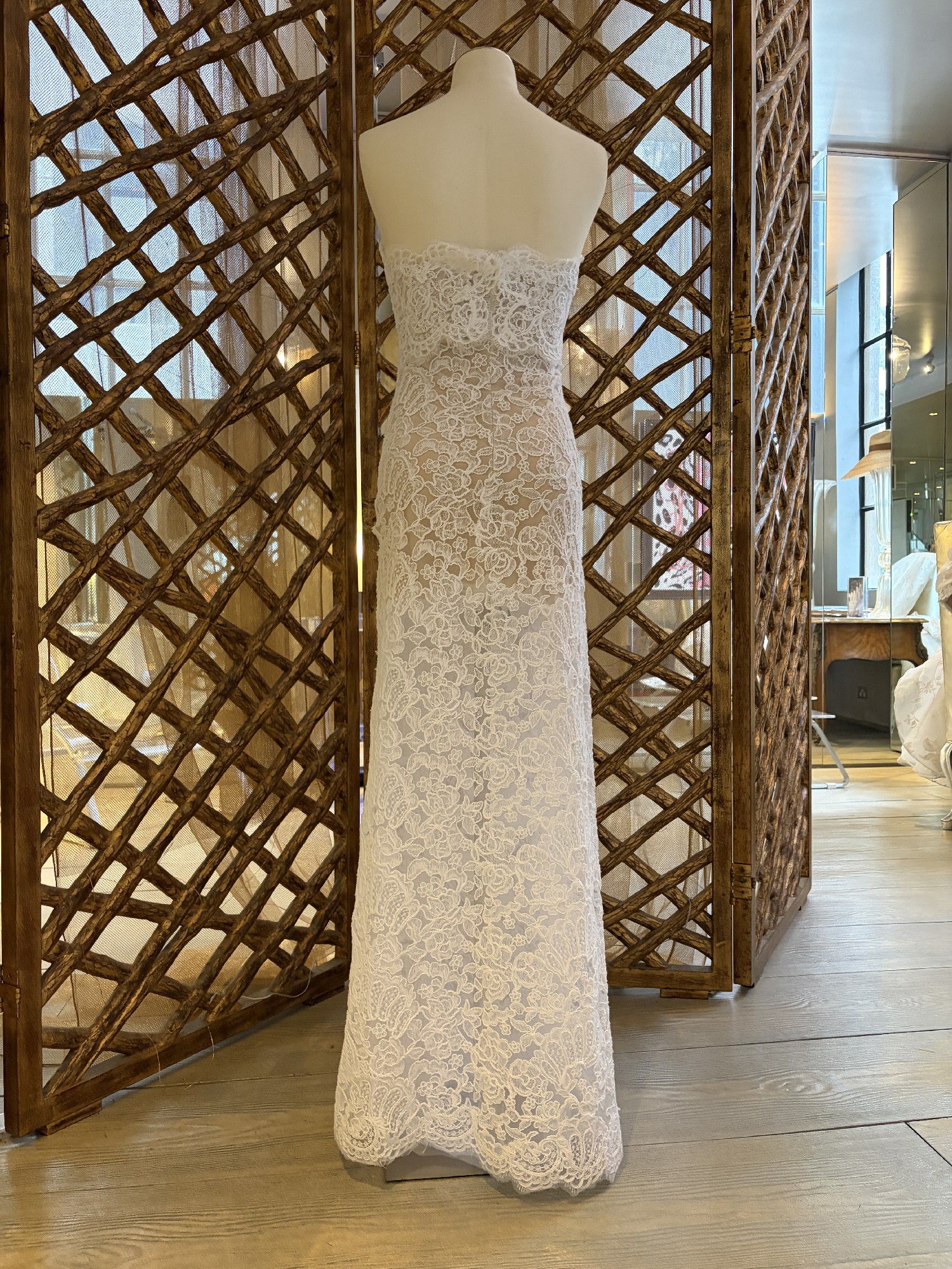 Ermanno Scervino new worn lace strapless column-style dress with interior lining and sheer skirt.