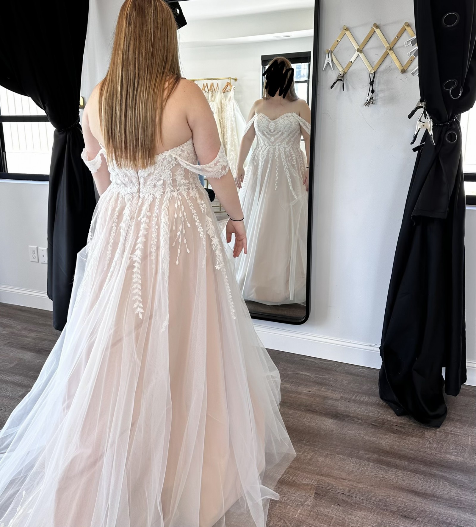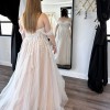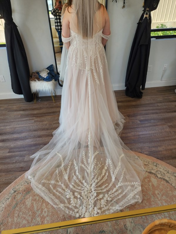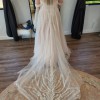 Evie Young’s Description: “ Soft, ethereal and romantic, Zyla has it all. Blending modern bold lace with her classic Aline design in perfect harmony. Featuring a strapless sweetheart neckline bodice with detachable off-shoulder straps that add an extra element of femininity and allow for two different bridal looks. Zyla is equally stunning from the back with vertical lace placement flowing down to a 30” illusion train.”