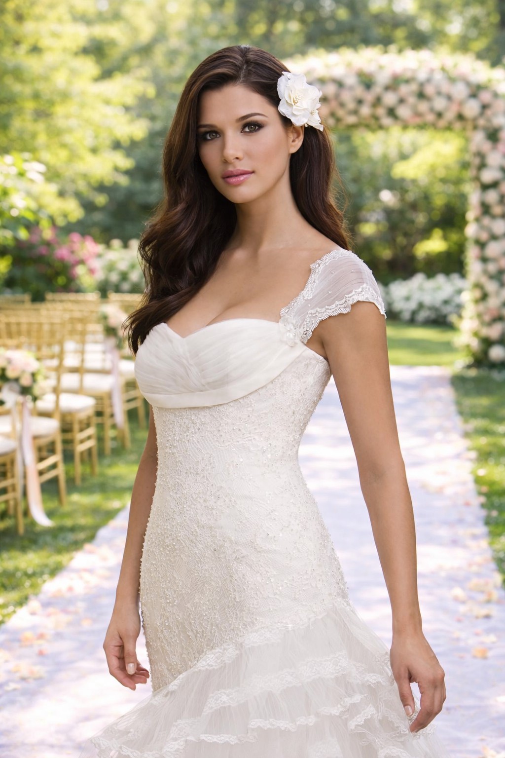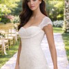 The capped sleeves (removable) provide a subtle sophistication, allowing your arms to move freely as you celebrate. The intricate beading shimmering atop the lace creates a stunning interplay of light, catching the eyes of guests as you glide down the aisle. As an extraordinary feature, this gown includes detachable sleeves, giving you the flexibility to switch up your look from ceremony to reception with effortless grace.