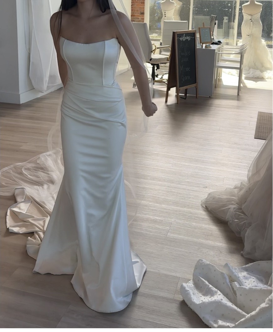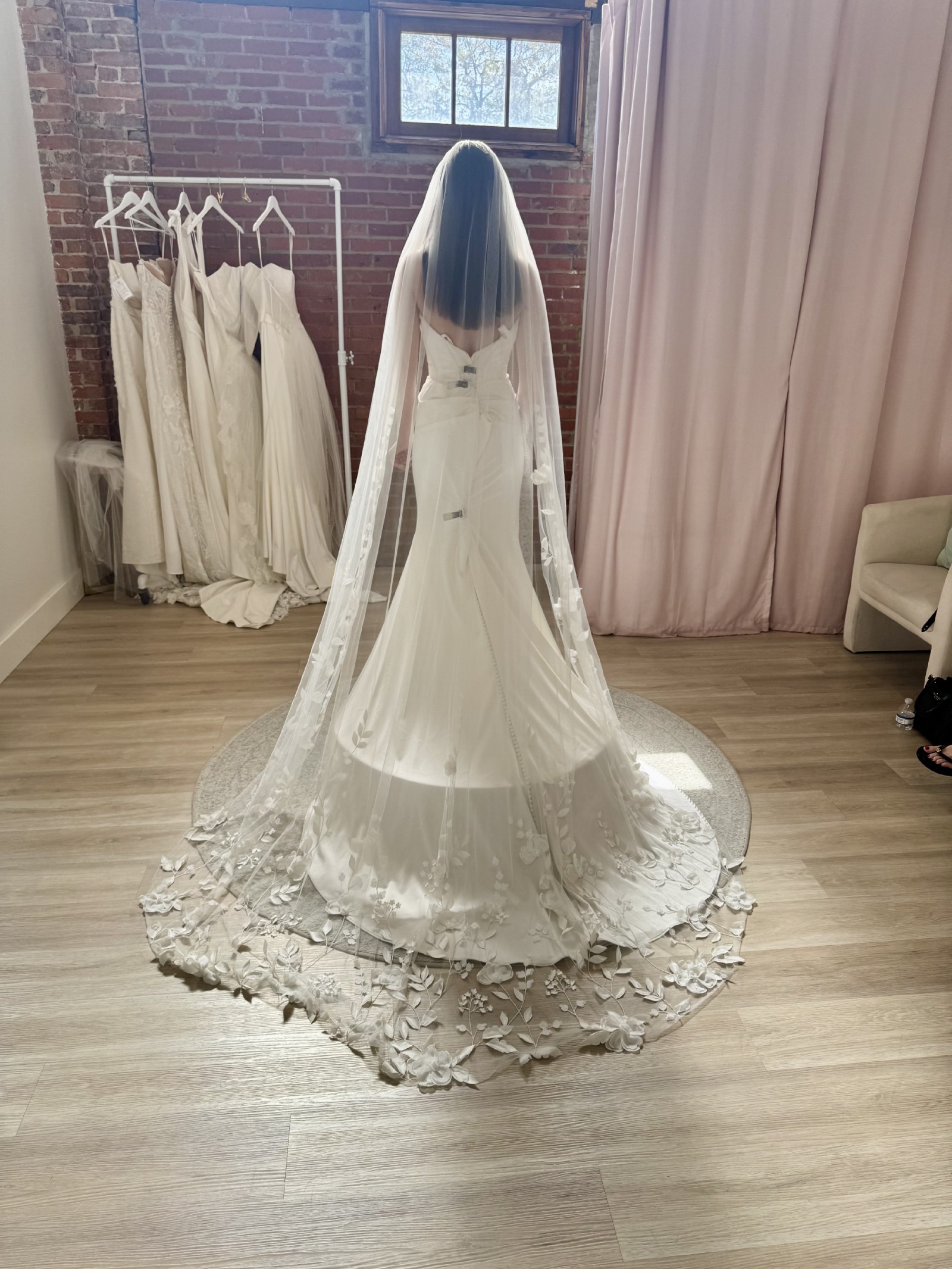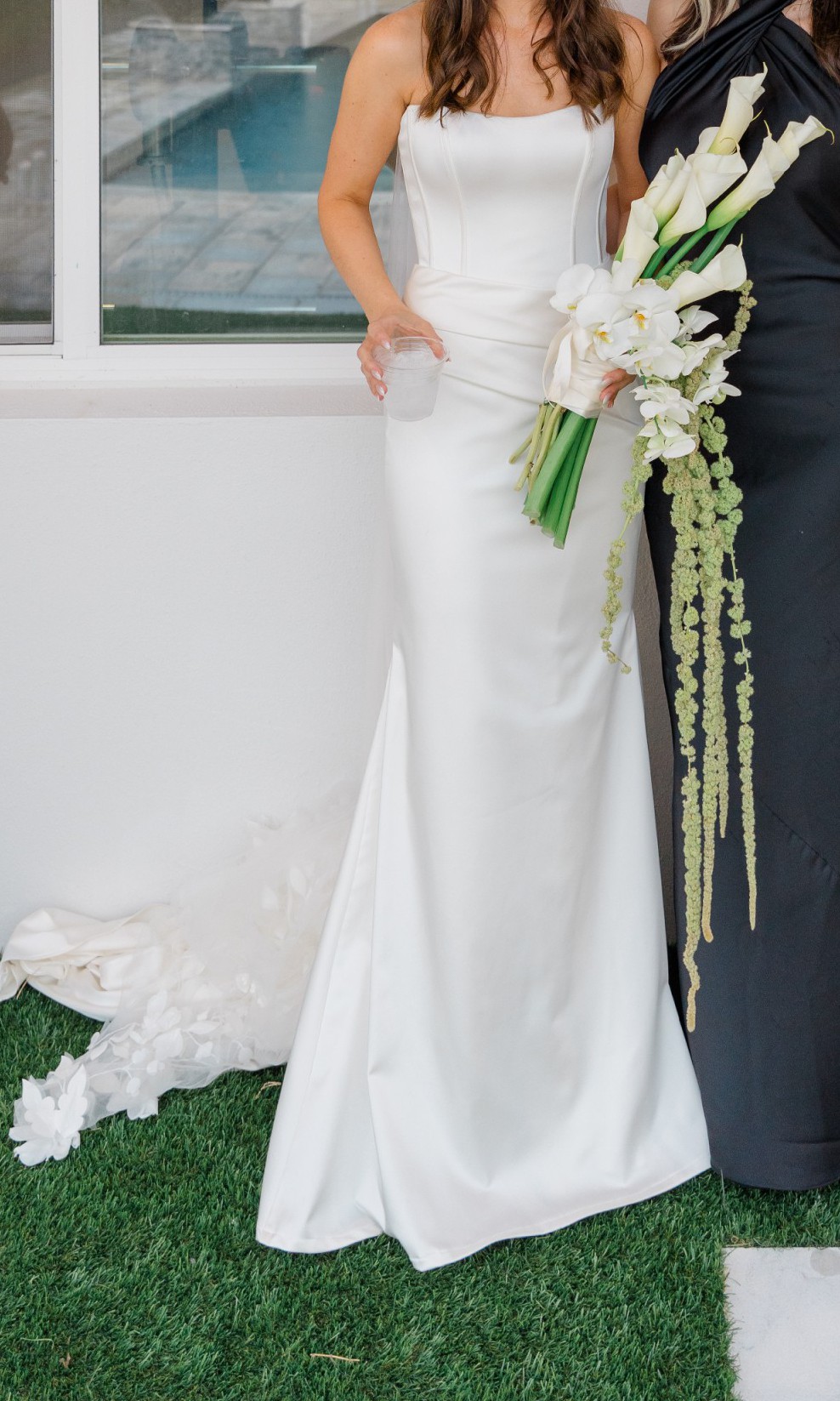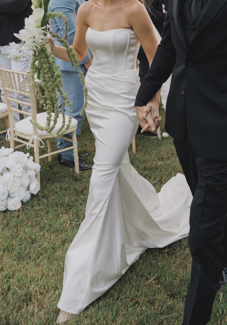 This Celine dress by Kelly Faetanini is the embodiment of elegance and sophistication that made my wedding day truly unforgettable. The fit-and-flare silhouette beautifully hugged my curves and created an enchanting. The luxurious satin fabric glided effortlessly with every movement, reflecting a soft glow.