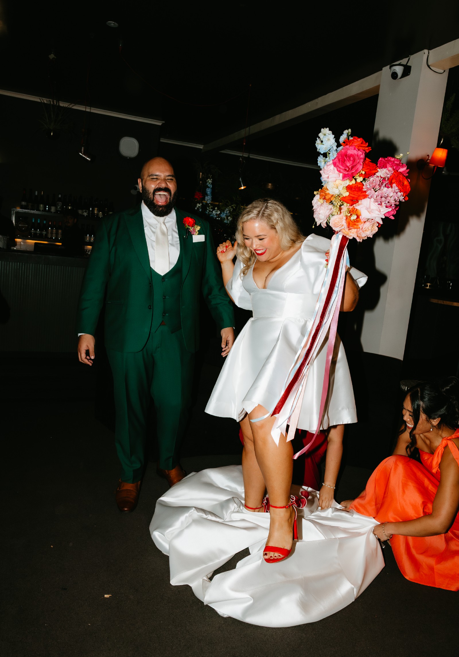 The Camille overture skirt is buttoned and easily removable creating a fun and surprising moment for your guests during the reception! The skirt has a short train that can be pinned for easy movement. The back is buttoned down the back.