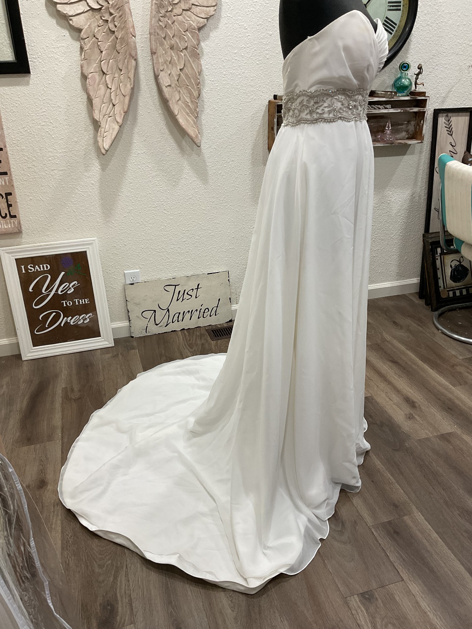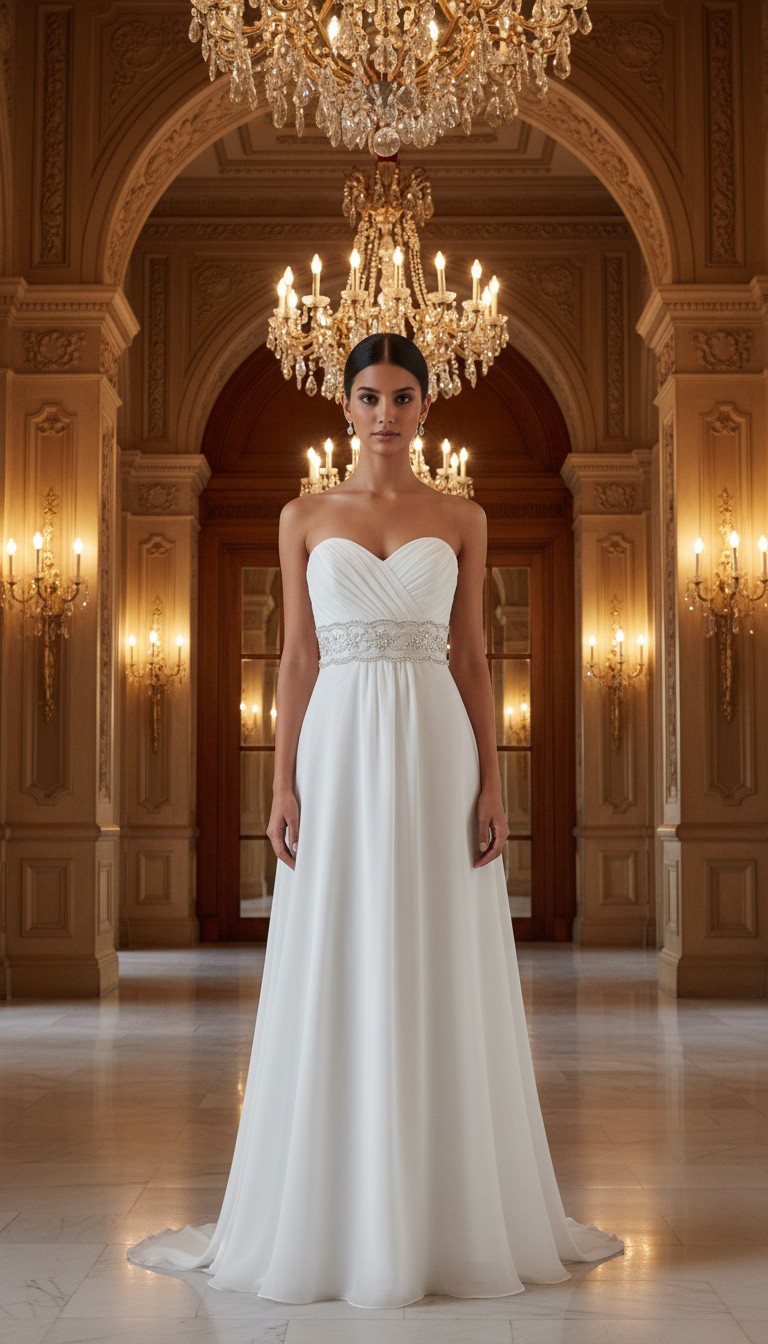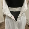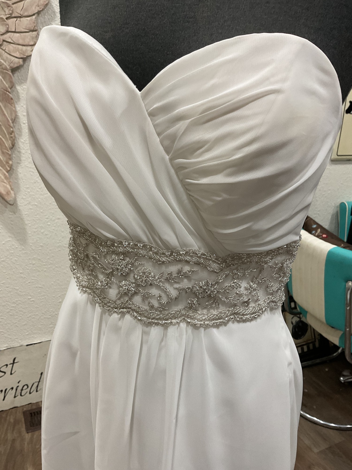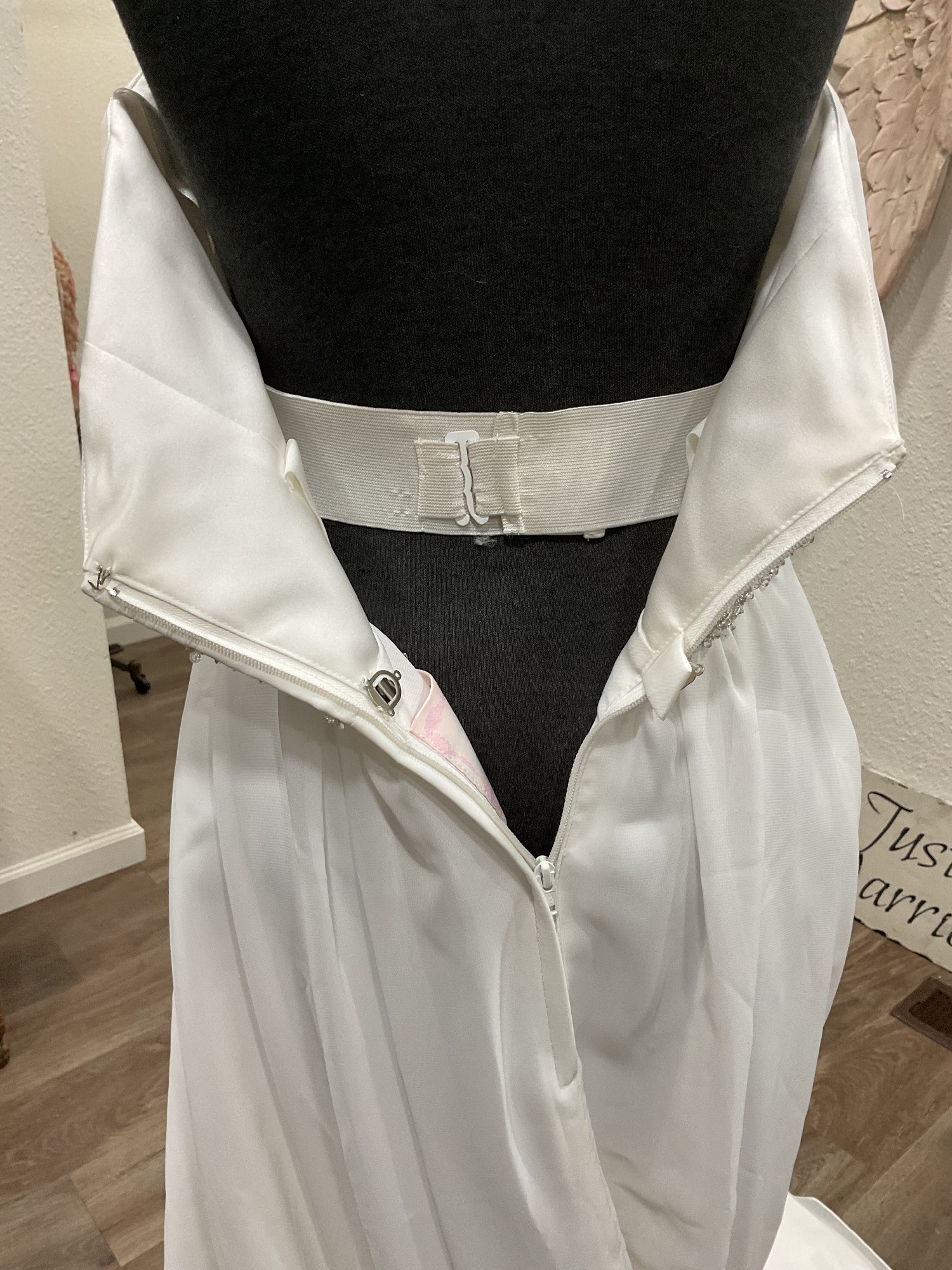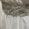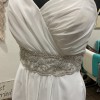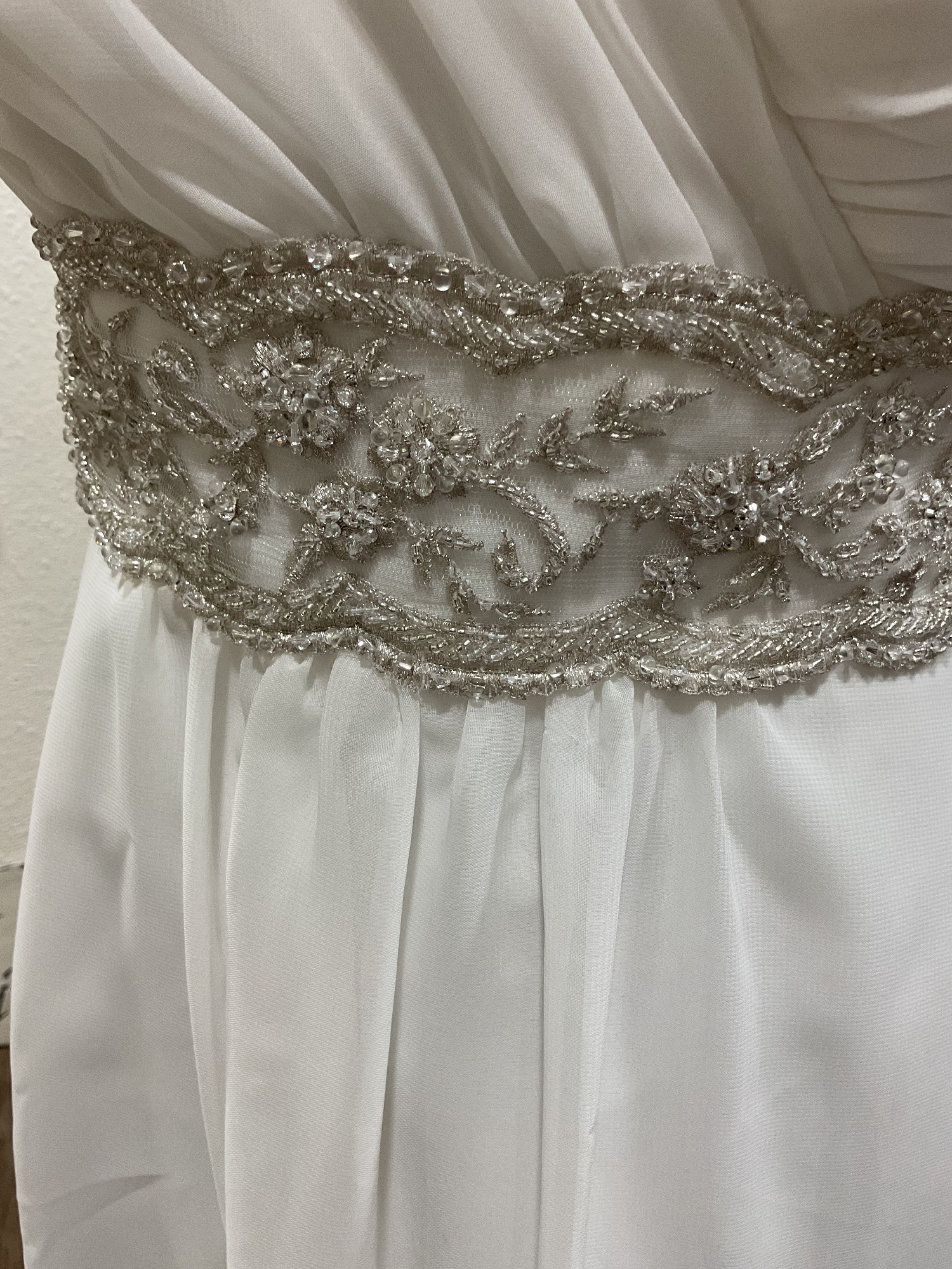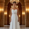 Crafted from luxurious white polyester, the material feels like chiffon and the inner slip is just like heavy satin while the gown features exquisite details that are nothing short of enchanting. Sparkling beading, shimmering crystals, and intricate embroidery create a mesmerizing visual impact, while delicate sequins catch the light, ensuring you shine brilliantly on your special day. The mid-back design offers comfort and elegance, allowing you to move with confidence as you celebrate.