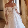 These off-shoulder sleeves are detachable, allowing the gown to be worn as a classic strapless silhouette for two distinct bridal looks.