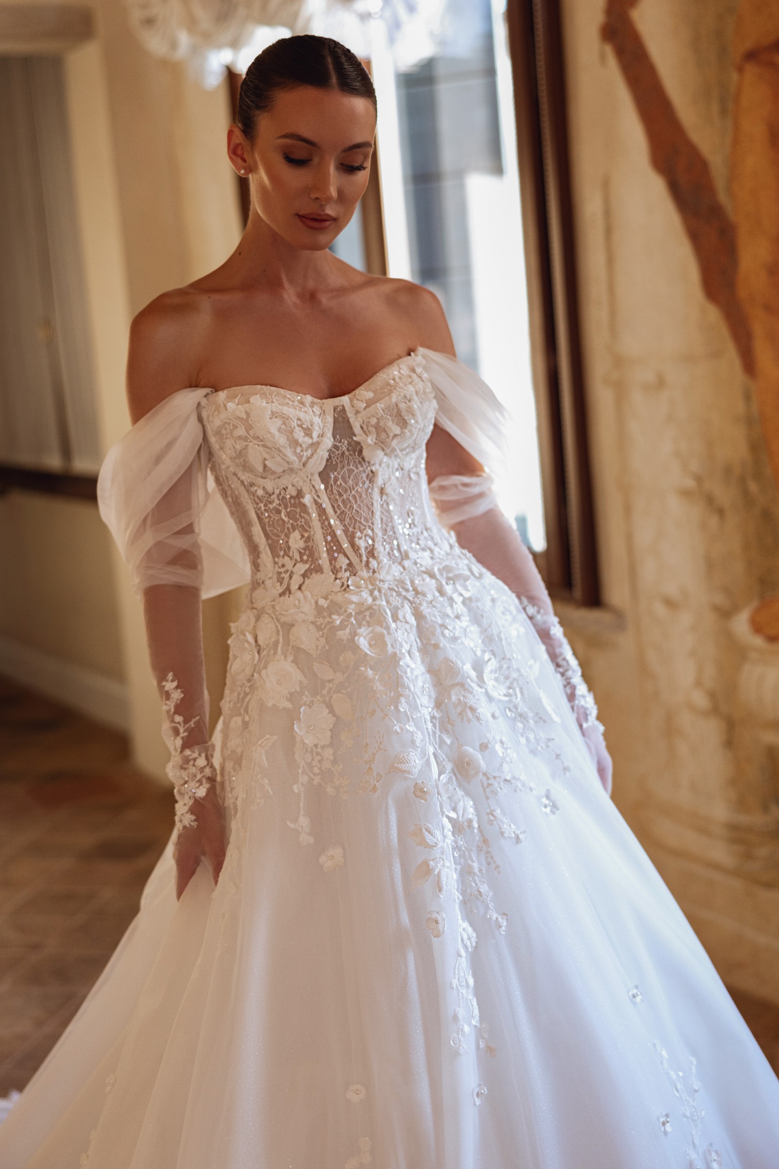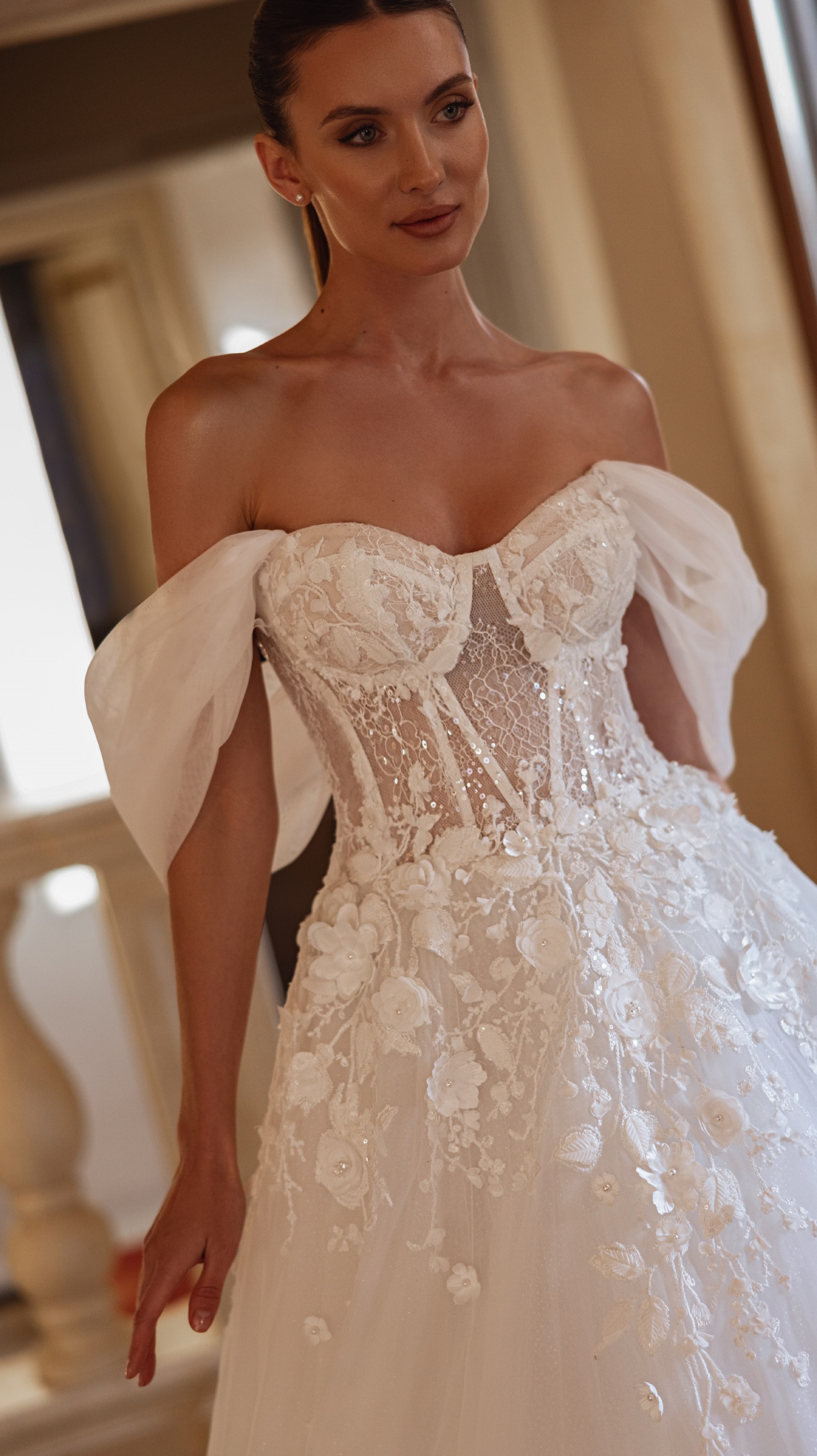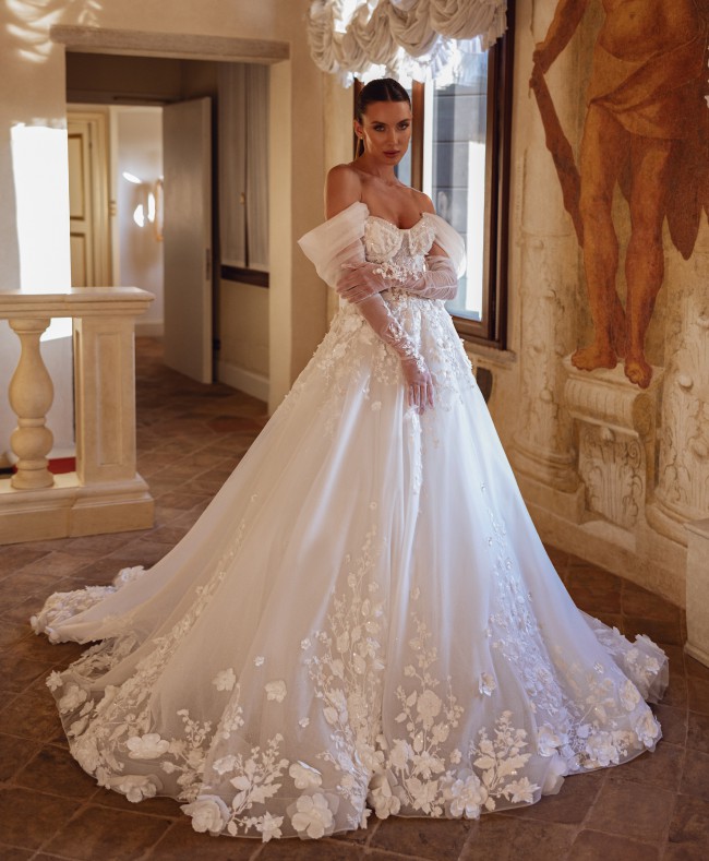 This breathtaking ball gown captures pure romance with its delicate detailing and ethereal volume. Designed for the bride who dreams of a fairytale silhouette, the gown combines refined structure with soft, dimensional texture.