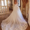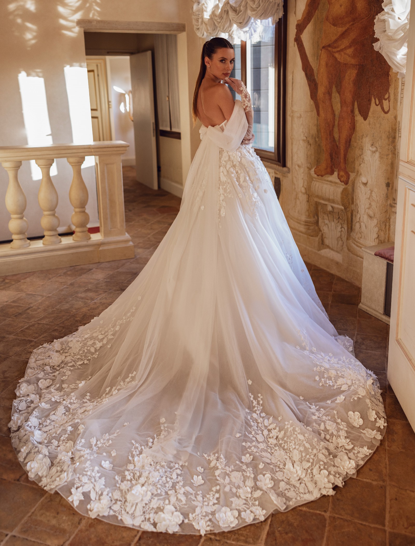 The full skirt flows effortlessly into a dramatic, cathedral-style train adorned with three-dimensional floral appliqués, creating movement and visual depth from every angle.