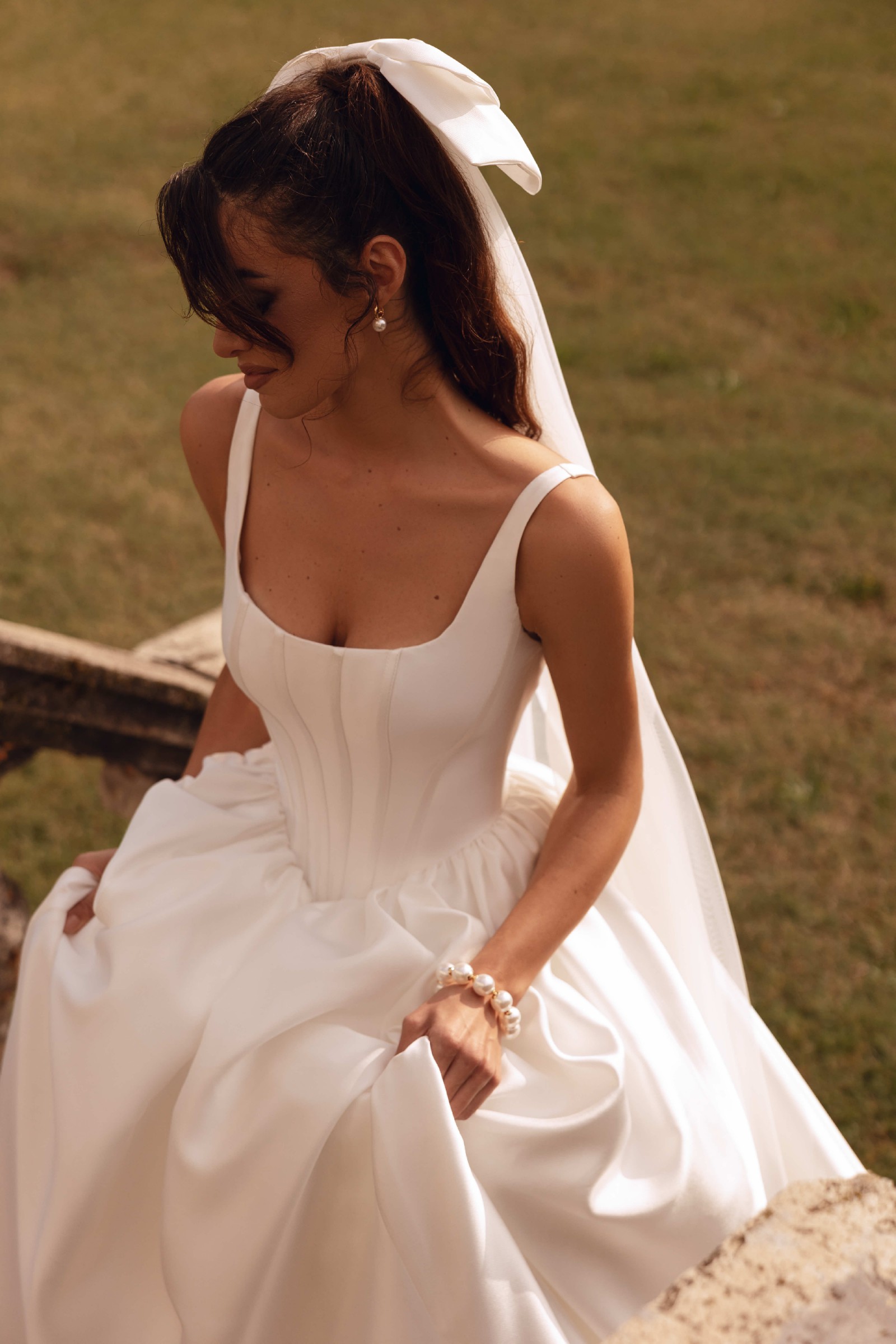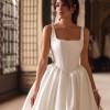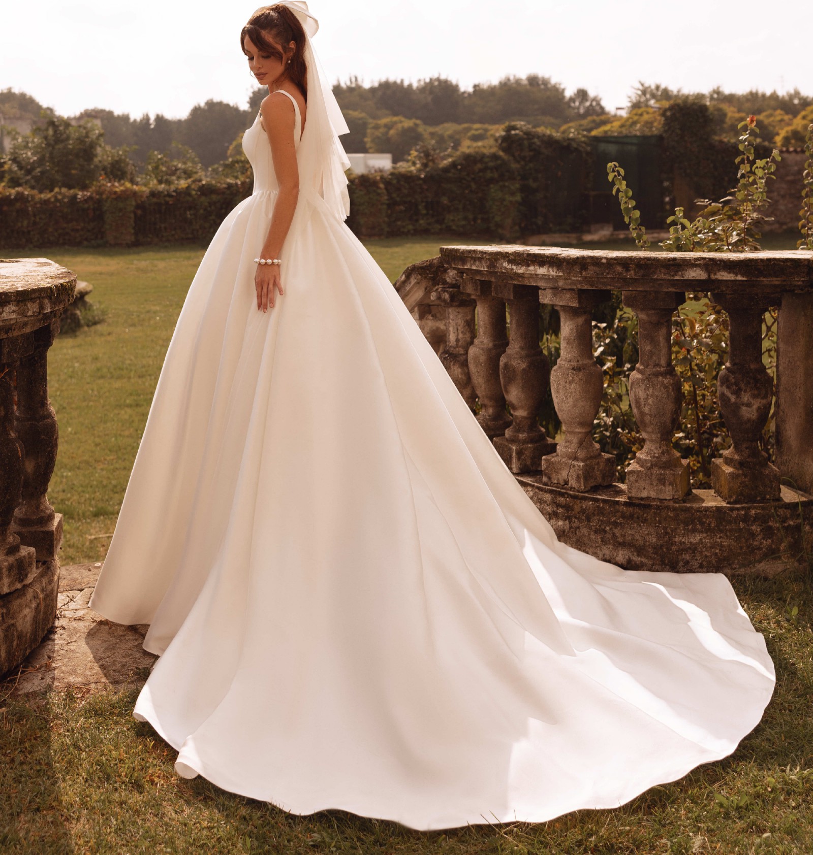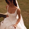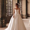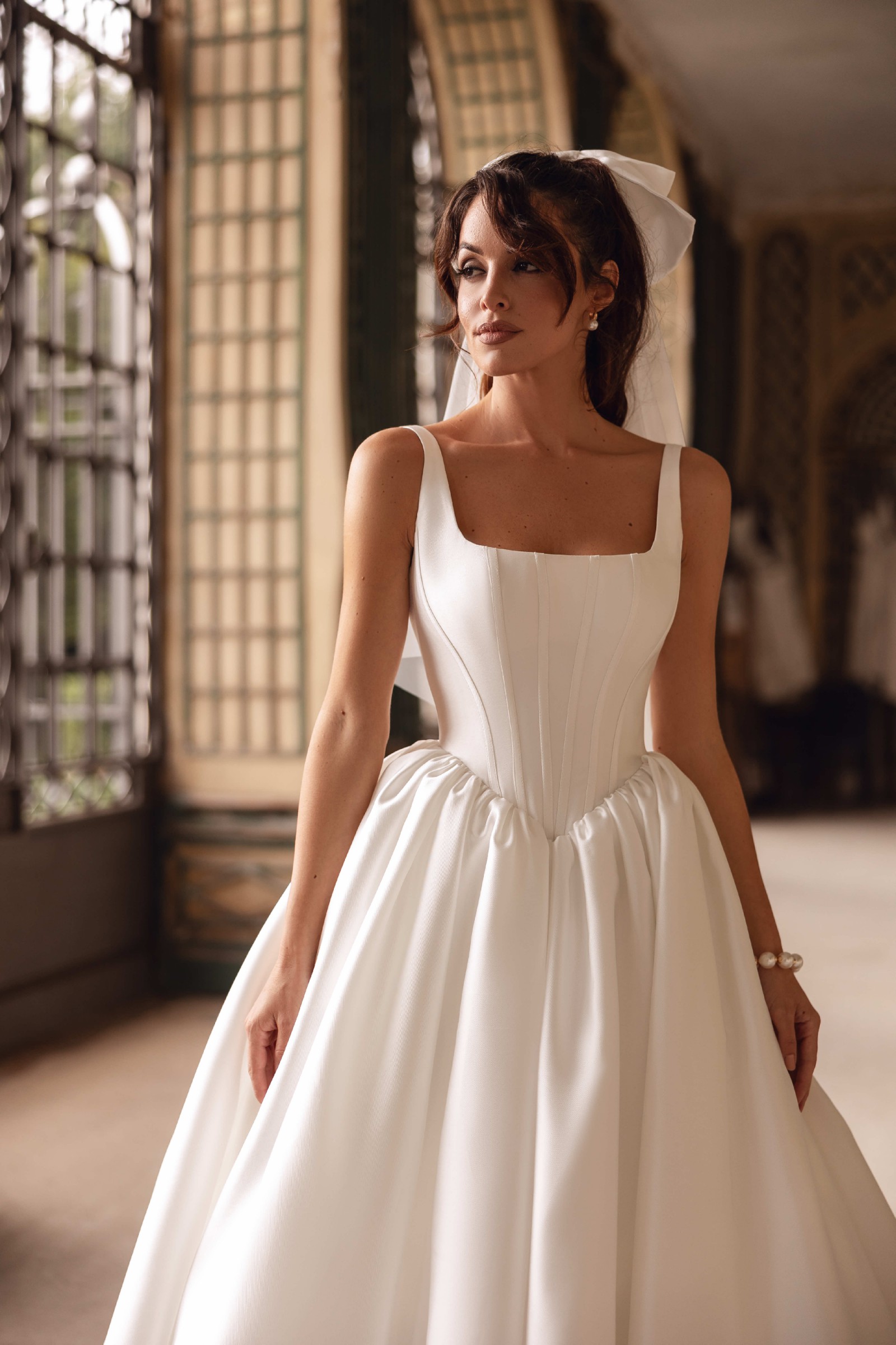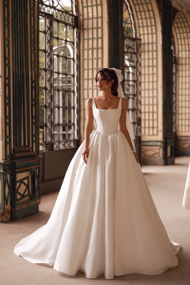 The structured bodice features wide straps and a softly squared neckline that beautifully frames the décolletage. The gown is designed with a corset bodice featuring a basque waist (pointed waistline), elongating the torso and accentuating the waist for a regal, feminine silhouette. The subtle corset-style seaming enhances structure and support while maintaining a minimalist aesthetic.