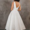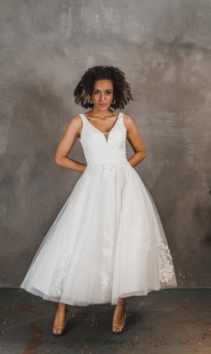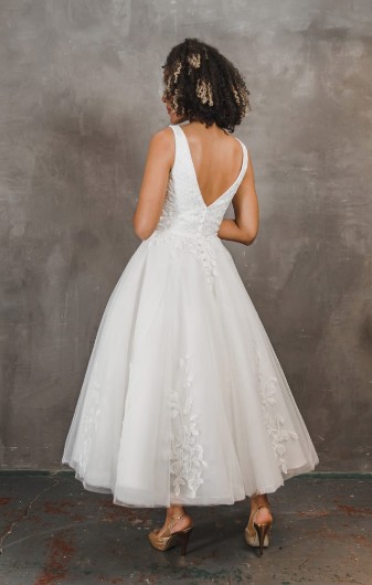 * Tea-length tulle bridal gown with soft, romantic silhouette