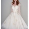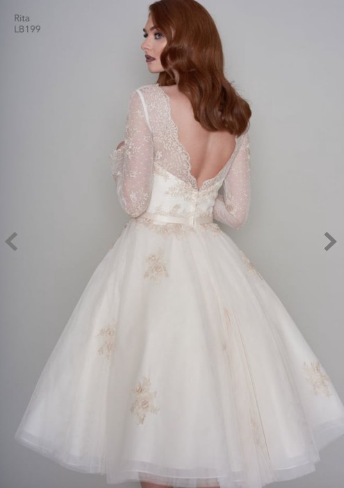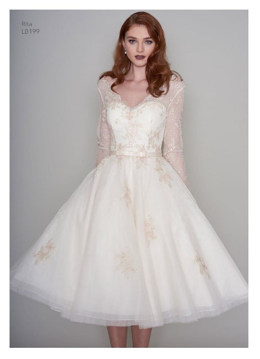 RITA by Loulou Bridal - A stunning Lace and Tulle Ivory & Gold 1950s 60s Inspired Tea Length Short Wedding Dress with Full Sleeve.