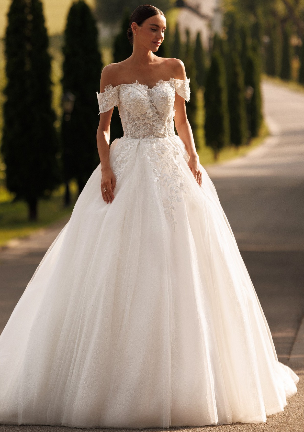 The gown flows into a voluminous tulle skirt that moves gracefully with every step, extending into a soft, elegant train for a truly majestic presence. Light-catching details throughout the skirt add a delicate glow under natural light.
