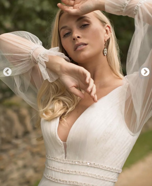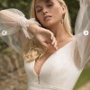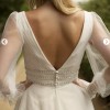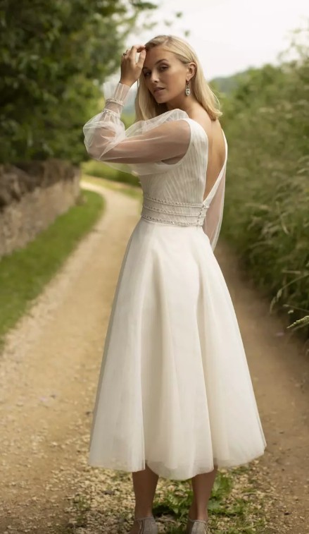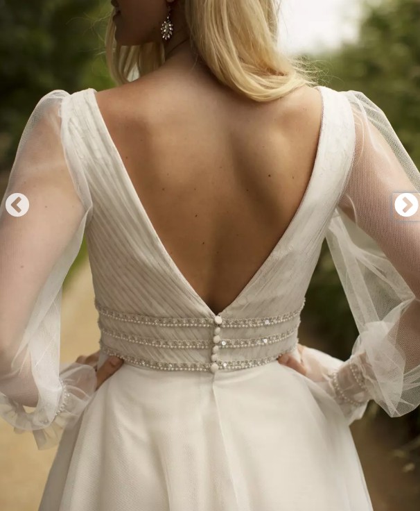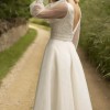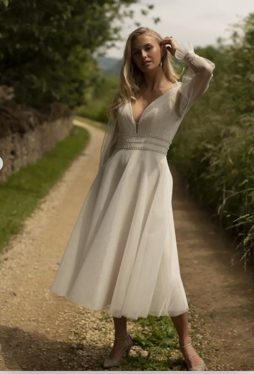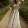 This vintage style is inspired by the elegance and grace of the 1940s with a modern day twist. This gown features a plunging front neckline that is echoed with a deep V back finishing at the wide waist band which is trimmed with rows of gold lace. The bodice is crafted from softly pleated tulle over a gold allover lace that leads to long soft tulle bishop sleeves which are finished with row of gold trim and a soft frill. A circular tulle skirt completes the style.
