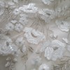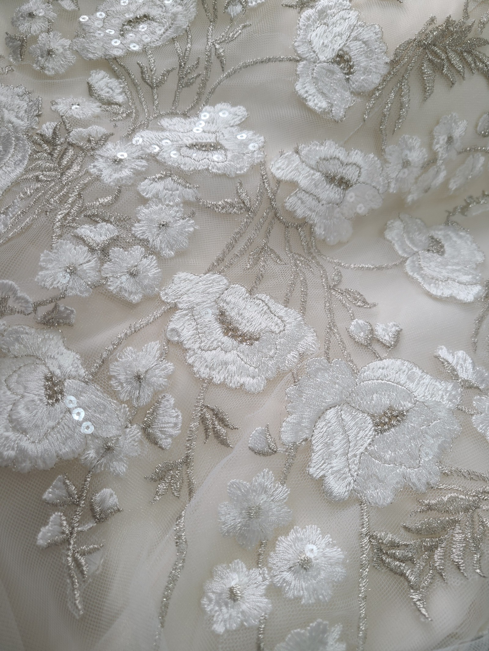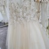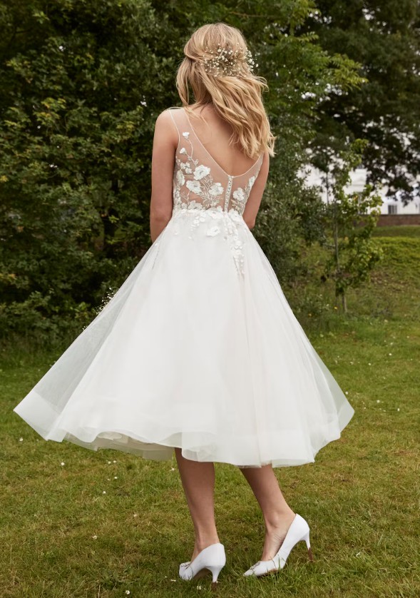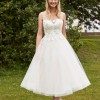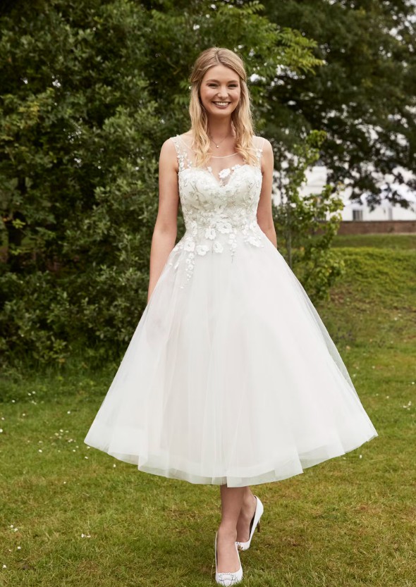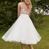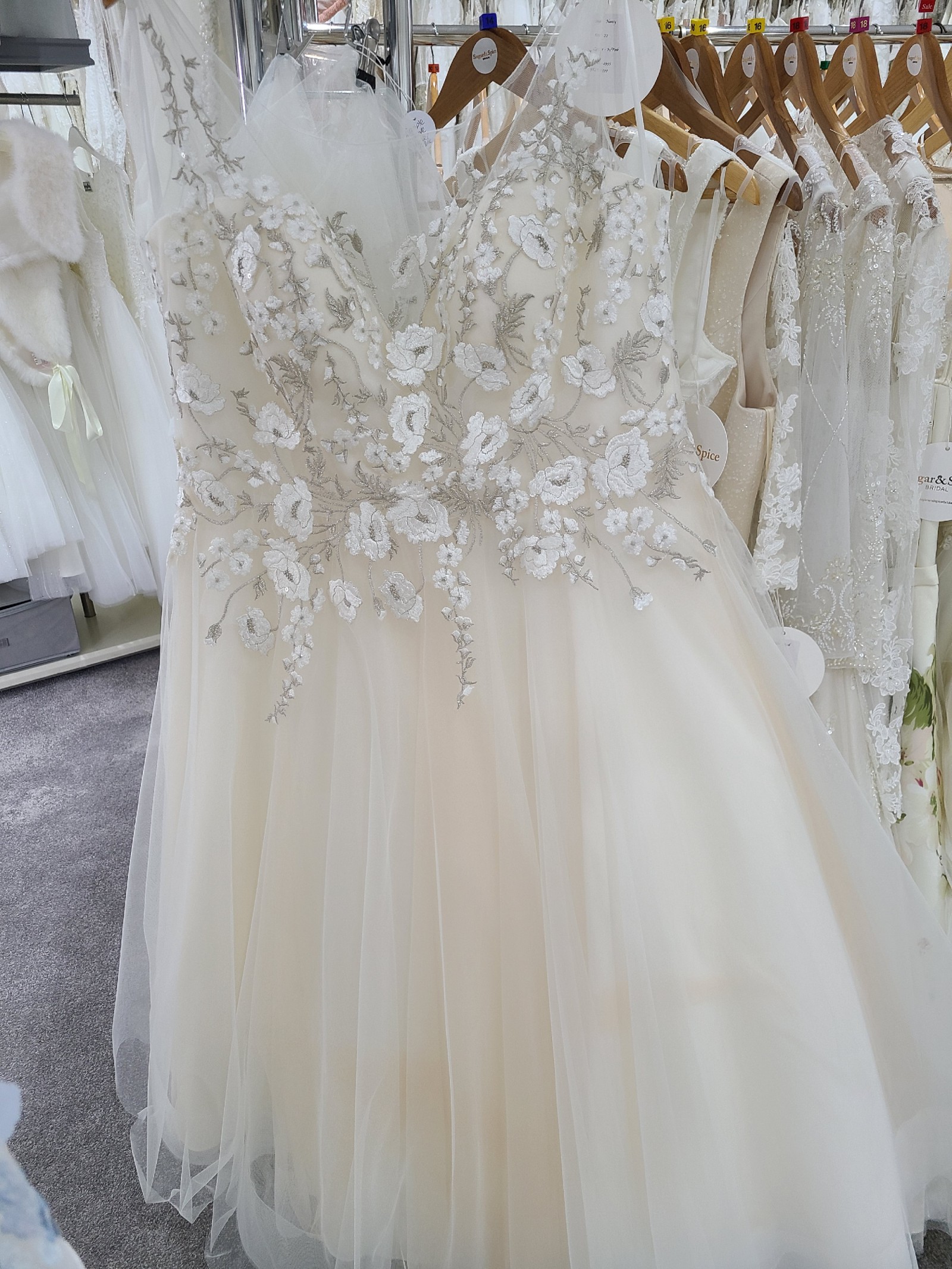 Nancy T-Length by Romantica of Devon Ivory with 1 soft blush/pink tulle underskirt layer. Ivory flower detail with Metalic silver stitching.