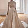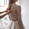 This breathtaking gown features a fully hand-embellished illusion bodice adorned with intricate pearl beading arranged in sculptural, flowing patterns. The high neckline and long fitted sleeves create a refined, regal silhouette while the sheer base subtly enhances the design’s delicacy and dimension.