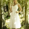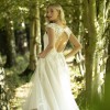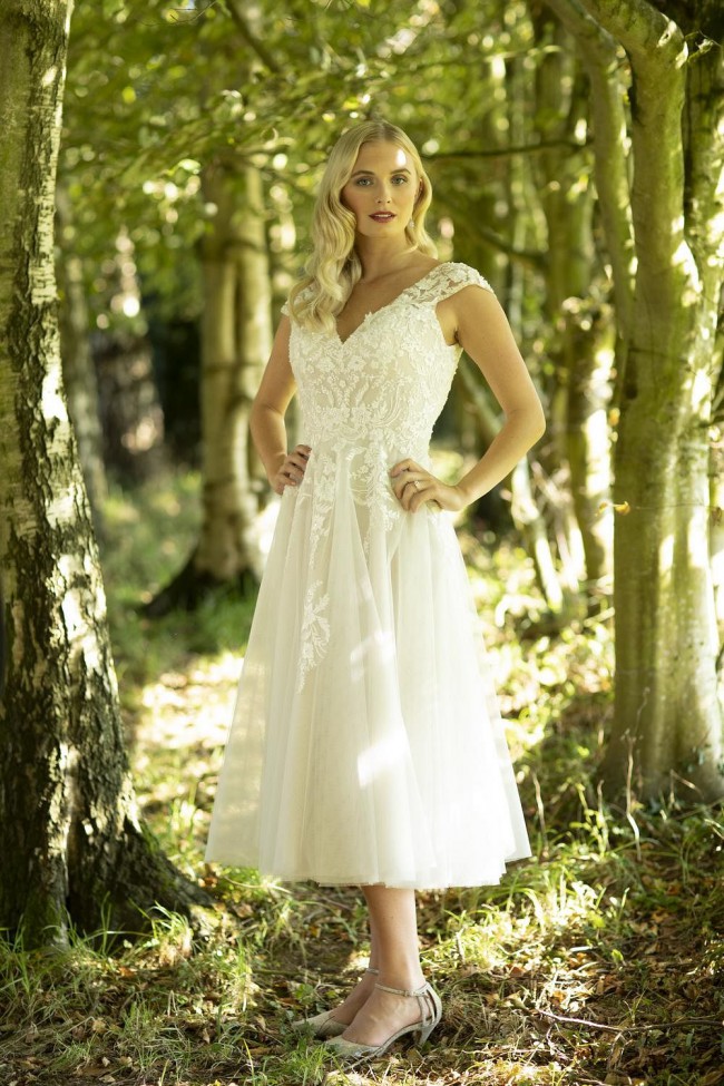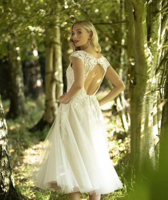 Magnolia by Brighton Belle (True Bride) is a dreamy, vintage-inspired tea-length wedding dress featuring a beaded lace bodice, V-neckline, dramatic open back, and illusion lace cap sleeves. This 1950s-style gown is designed for a retro, romantic look, typical of the brand's short, dancing-length bridal collection